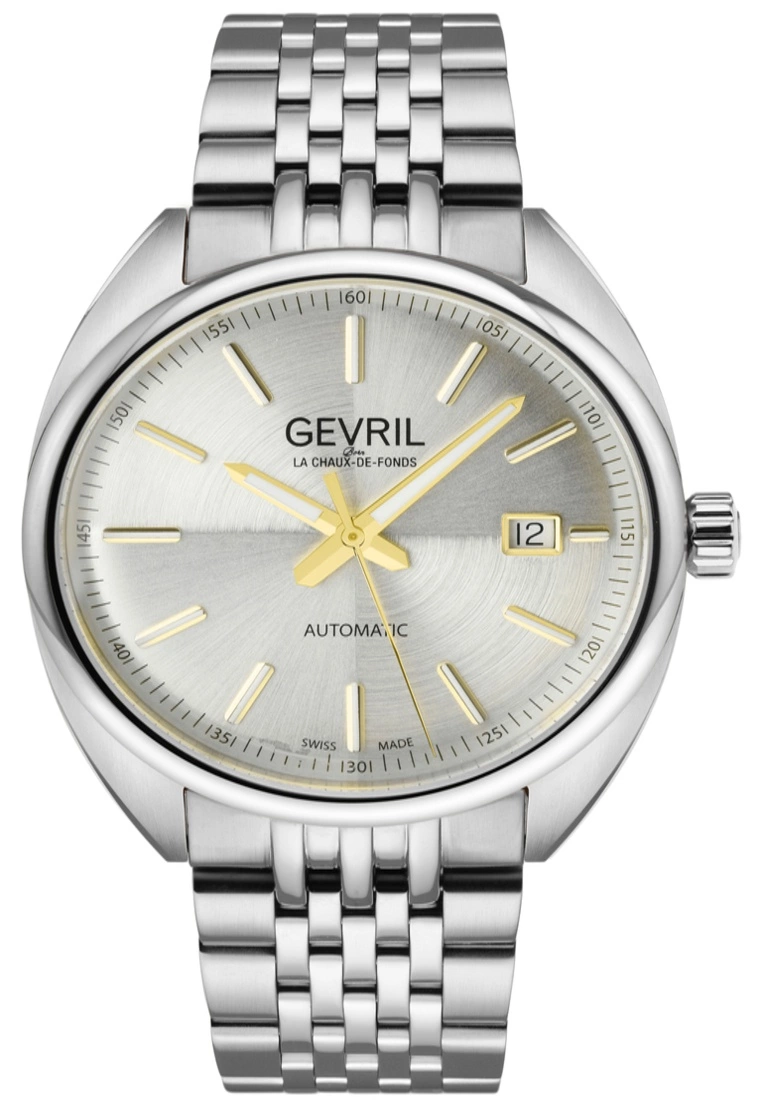 Gevril Men’s Swiss Automatic from the Five Points Collection40mm Round 316L Stainless Steel Case White Dial with Exhibition Case Back WindowDate at 3H, Yellow Gold Indices applied on dial, luminous handsCase back 4 screws, Push Pull Crown, Polished Bezel, Brushed Case316L Stainless Steel Bracelet with Deployment BuckleAnti-reflective Sapphire CrystalWater Resistant to 50 Meters/5ATMSwiss Made Automatic Sellita SW200 Movement