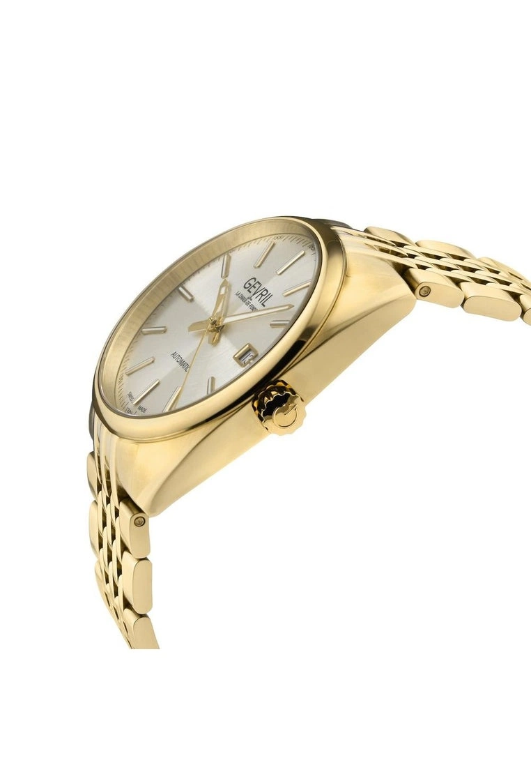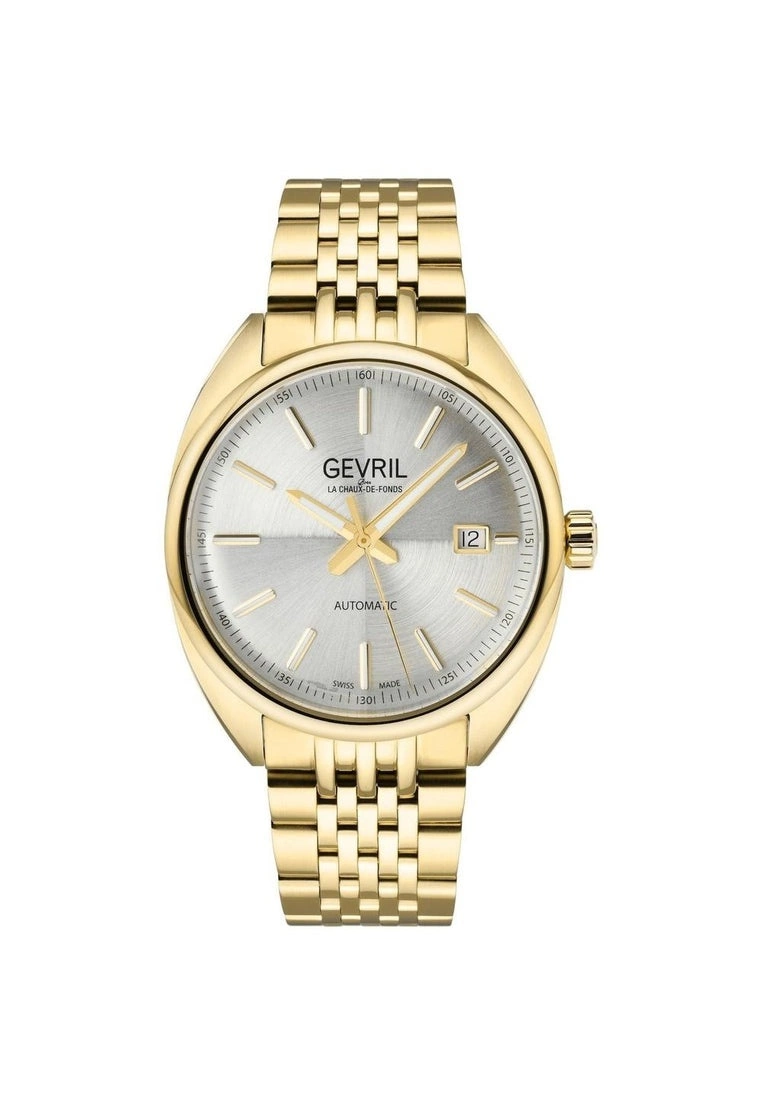 Gevril Men’s Swiss Automatic from the Five Points Collection40mm Round IPYG Case White Dial with Exhibition Case Back WindowDate at 3H, Yellow Gold Indices applied on dial, luminous handsCase back 4 screws, Push Pull Crown, Polished Bezel, Brushed CaseIPYG Bracelet Bracelet with Deployment Buckle