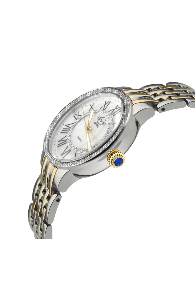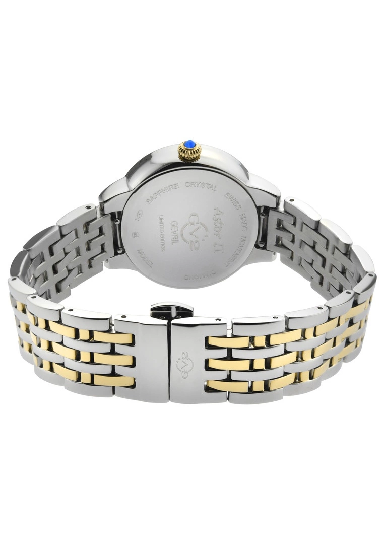 GV2 Women’s Swiss Watch from the Astor II Collection38mm 316L Stainless Steel Case with 50 Diamonds on BezelBrilliant White MOP Dial with Black Indices, 4 Single Cut Diamonds on DialPush Pull Fluted crown with Blue cabochon StoneTwo toned 316L Stainless Steel Yellow Gold Bracelet with Deployment BuckleAnti-reflective Sapphire CrystalWater Resistant to 30 Meters/3ATMSwiss Quartz Movement Ronda 763