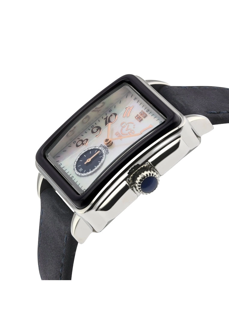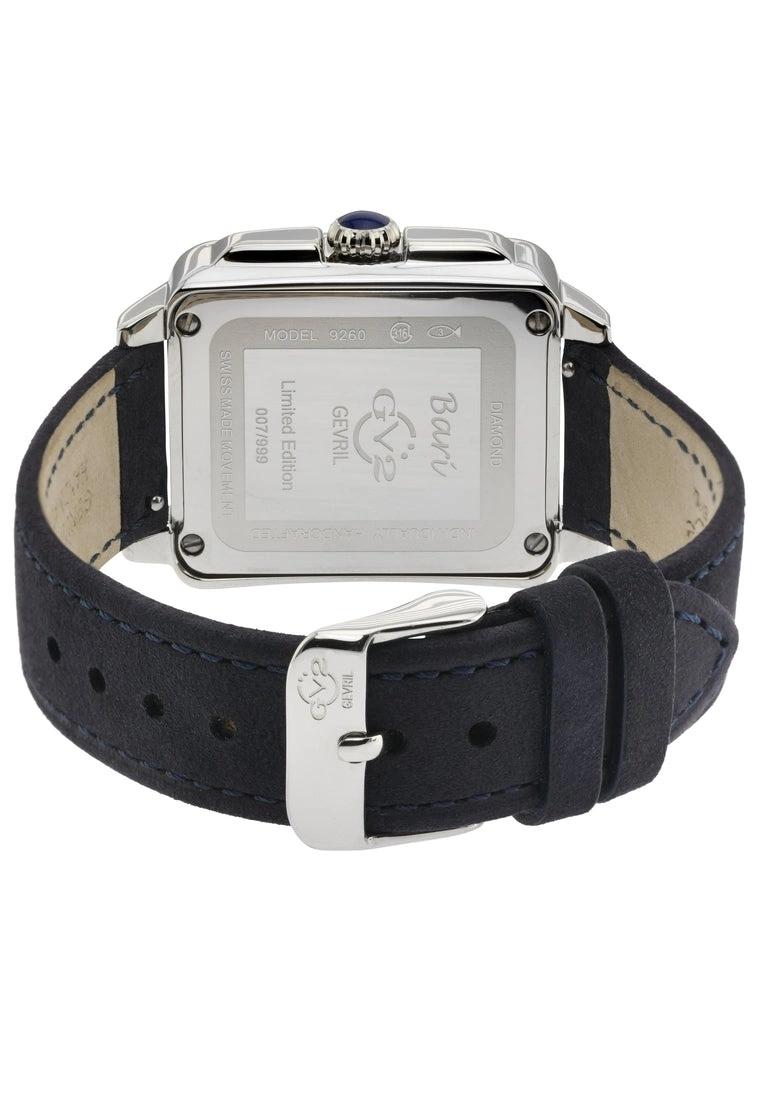 GV2 Women’s Swiss Watch from the Bari Collection37 mm Square 316L Stainless Steel Case, Blue Enamel BezelWhite MOP Dial, 4 Diamonds at 12:00, Blue Diamond Cut ring at 6:00Push Pull Fluted crown with Blue cabochon StoneGenuine Italian Blue Suede Leather Strap with Tang BuckleAnti-reflective Sapphire CrystalWater Resistant to 30 Meters/3ATM