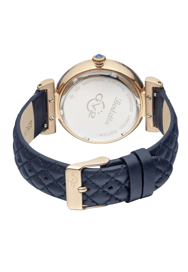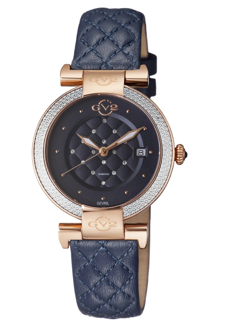 Your eye is immediately drawn to the tastefully quilted dial, set with fifteen genuine diamonds. Small discrete raised studs serve as indices and a fluted crown capped with a blue cabochon enhances the inspired design. A glittering diamond cut bezel framed by lugs embellished with the GV2 logo encircles the exquisitely crafted dial.SpecificationsGV2 1509-L3 Women’s Berletta Diamond Swiss Quartz WatchGV2 Women’s Berletta Diamond Swiss Quartz Watch37 mm Round case with Small discrete raised studs serve as indices and a fluted crown capped with a blue cabochonBlue dial with quilt pattern and 15 diamonds (CT. 0.0044)Glittering diamond cut bezel framed by lugs embellished with the GV2 logo encircles the exquisitely crafted dial.Blue Quilted Genuine Leather Strap with Tang BuckleAnti-reflective Sapphire CrystalWater Resistant to 50 Meters/5ATMSwiss Quartz movement Ronda 705