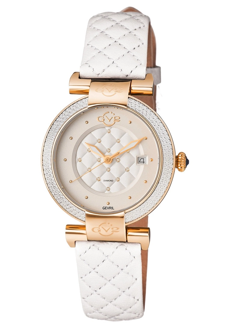 Your eye is immediately drawn to the tastefully quilted dial, set with fifteen genuine diamonds. Small discrete raised studs serve as indices and a fluted crown capped with a blue cabochon enhances the inspired design. A glittering diamond cut bezel framed by lugs embellished with the GV2 logo encircles the exquisitely crafted dial.SpecificationsGV2 1502-L2 Women’s Berletta Diamond Swiss Quartz WatchGV2 Women’s Berletta Diamond Swiss Quartz Watch37 mm Round case with Small discrete raised studs serve as indices and a fluted crown capped with a blue cabochonWhite dial with quilt pattern and 15 diamonds (CT. 0.0044)Glittering diamond cut bezel framed by lugs embellished with the GV2 logo encircles the exquisitely crafted dial.White Quilted Genuine Leather Strap with Tang BuckleAnti-reflective Sapphire CrystalWater Resistant to 50 Meters/5ATMSwiss Quartz movement Ronda 705