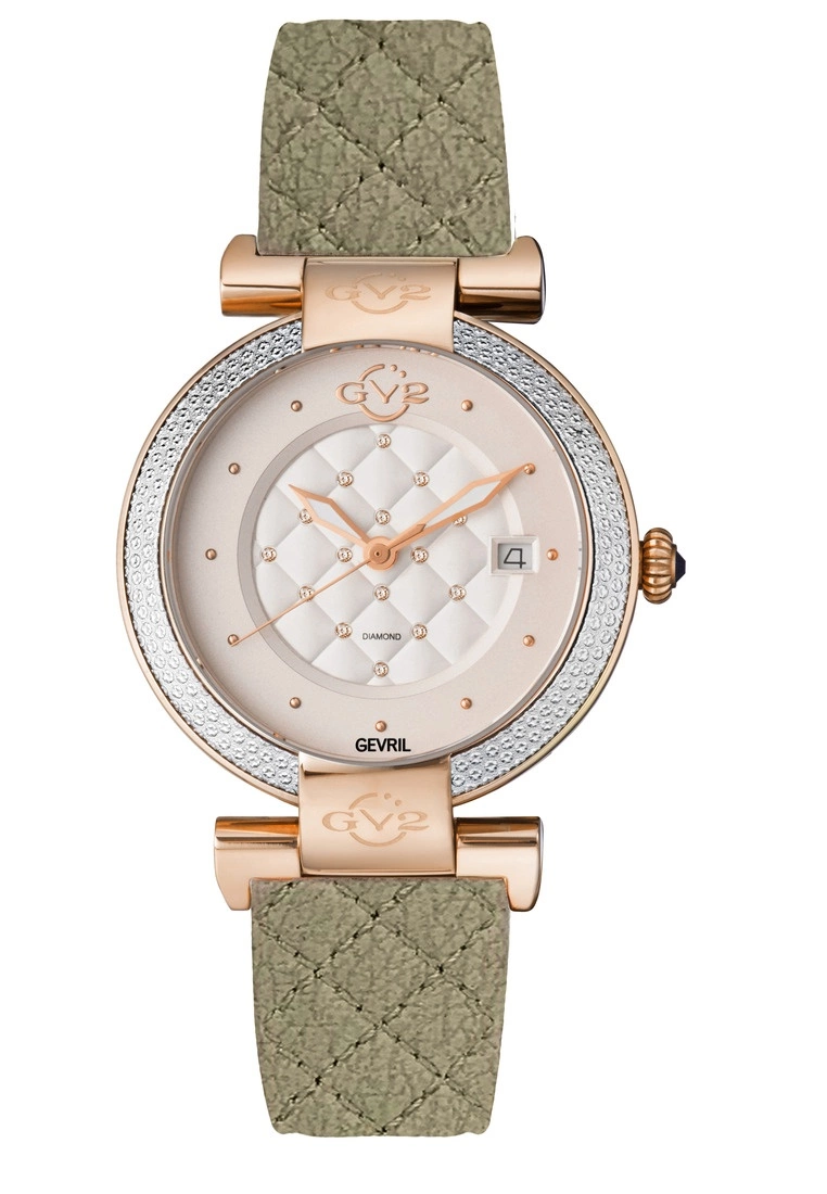 GV2 Women’s Berletta Diamond Swiss Quartz Watch37 mm Round IPYG case with Small discrete raised studs serve as indices and a fluted crown capped with a blue cabochonWhite dial with quilt pattern and 15 diamonds (CT. 0.0044)Glittering diamond cut bezel framed by lugs embellished with the GV2 logo encircles the exquisitely crafted dial.Olive Vegan Quilted Italian Hand Made Genuine Leather Strap with Tang BuckleAnti-reflective Sapphire CrystalWater Resistant to 50 Meters/5ATMSwiss Quartz movement Ronda 705