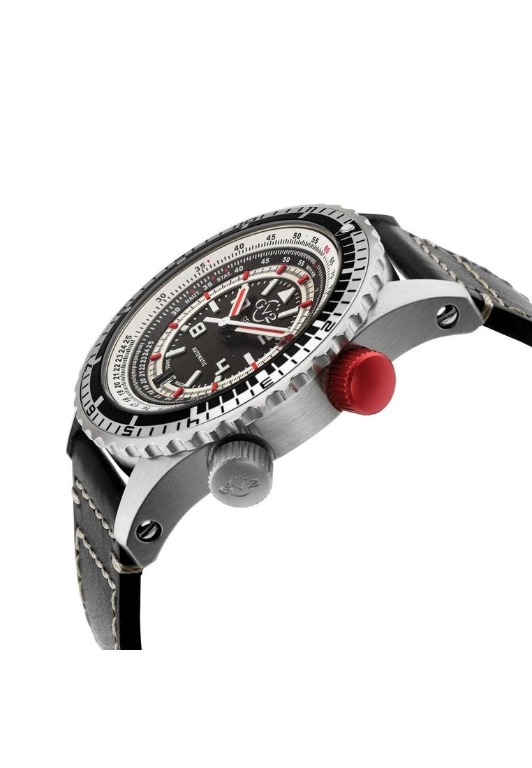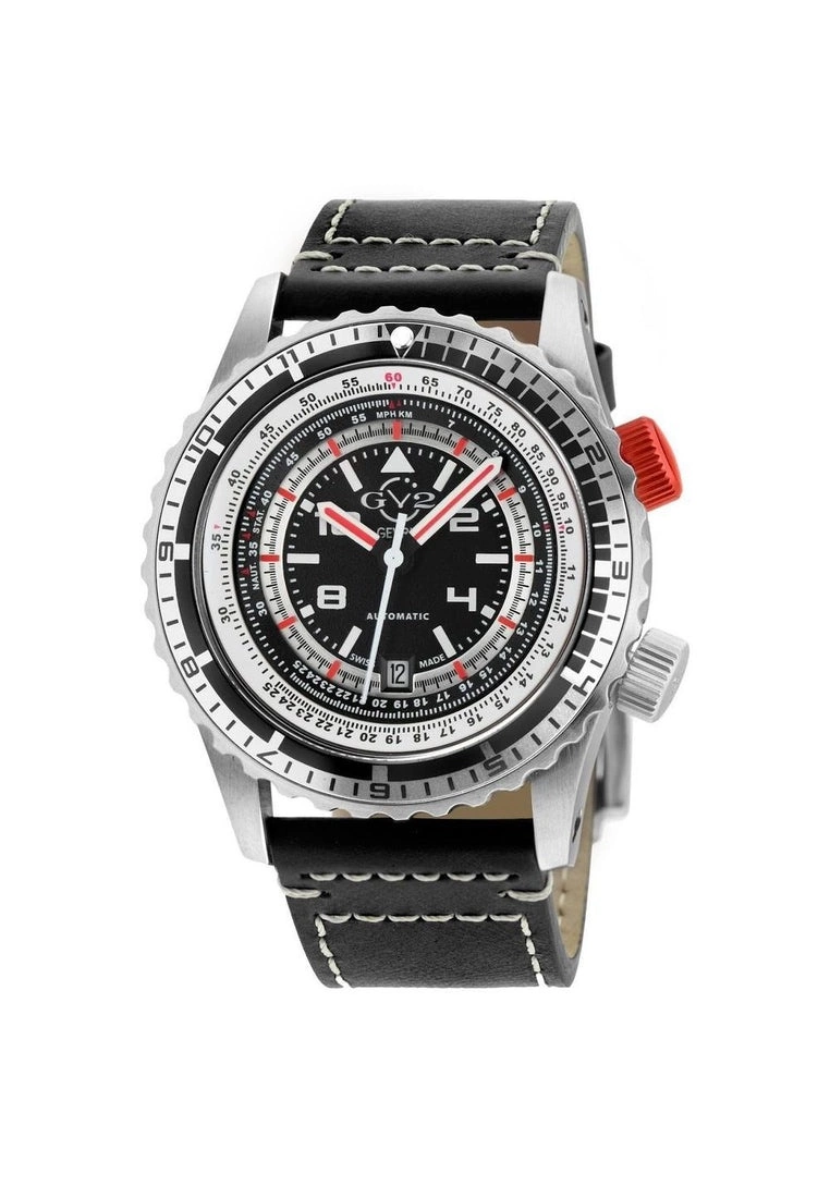 GV2 Men’s Automatic Watch from the Contasecondi Collection43mm Round Silver Case with unidirectional bezelRed Crown at 2H turns inner ring – 60 second counter, Date at 6H, luminous HandsGenuine Black Leather Straps-Sports White Stitching With Tang BuckleAnti-reflective Sapphire CrystalWater Resistant to 50 Meters/5ATMSwiss Automatic MovementÂ