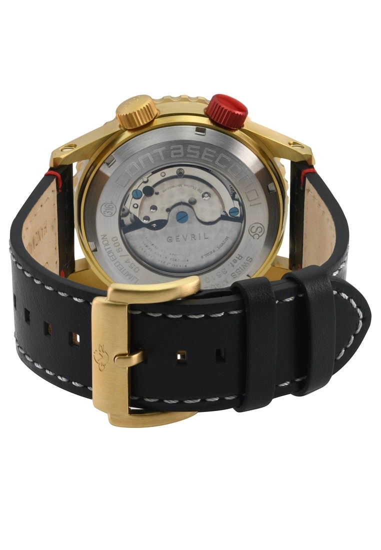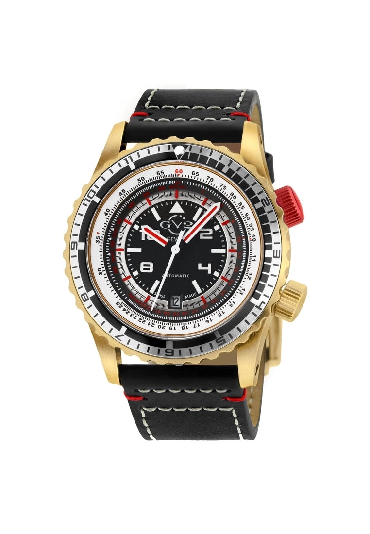 GV2 Men’s Automatic Watch from the Contasecondi Collection47mm Round IPYG Case with unidirectional bezelRed Crown at 8H turns inner ring – 60 second counter, Date at 6H, luminous HandsBlack Calf Leather Straps-Sports Stitching With Tang BuckleAnti-reflective Sapphire CrystalWater Resistant to 50 Meters/5ATMSwiss Automatic MovementÂ