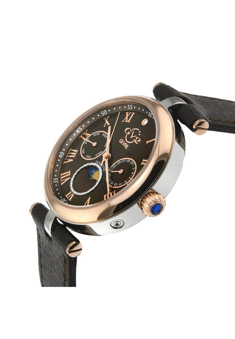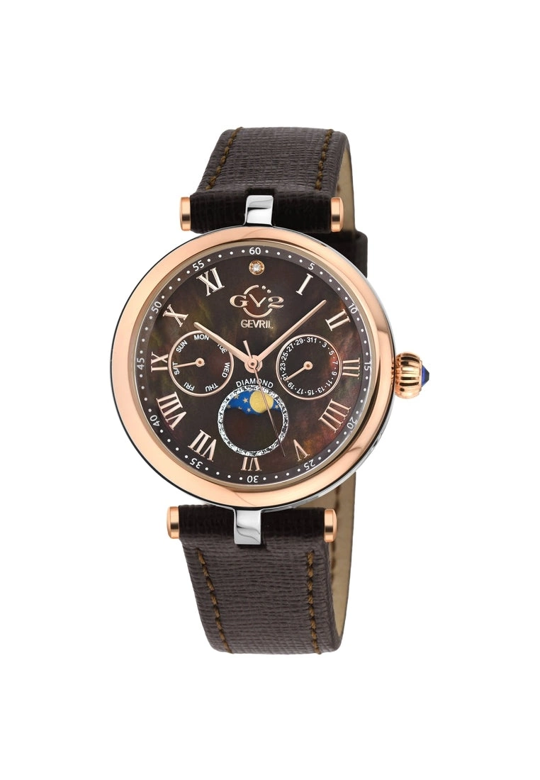 GV2 Women’s Swiss Quartz Watch from the Florence Collection36mm Round IPRG Case with Roman Numerals, Diamond at Twelve O’clockChocolate Brown MOP Dial, Day and Date Sub DialsPush Pull Fluted crown with Blue cabochon StoneGenuine Italian Brown Leather Strap with Tang Buckle