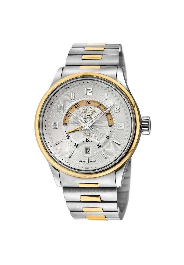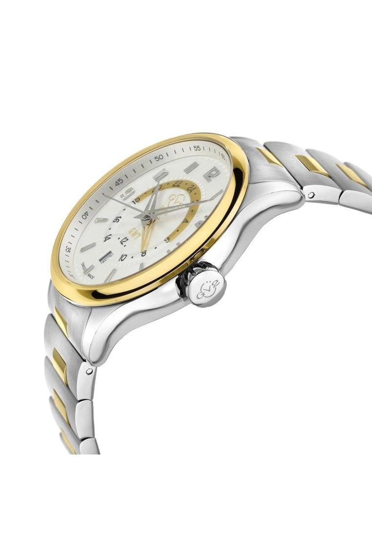Giromondo, Italian for globetrotter, is the ultimate high-powered, jet-setting companion. Built to out-perform on the go, this Quartz 42mm timepiece is GV2βs boldest statement yet. Swiss Quartz GMT movement powers the 42mm Case, Genuine Italian leather strap or Stainless Steel bracelet. Not to be confused with a Maserati or Ferrari, this model of Italian luxury can take you anywhere. GV2βs Giromondo β performance and technology made to move.SpecificationsGV2 42307B Men’s Giromondo Swiss Quartz WatchGV2 Menβs Swiss Quartz watch from the Giromondo Collection42mm SS Case with White Dial and 24 hour format on Inner DialPush Pull Crown, Date at 6 o’clockExhibition Case BackTwo Toned SS IPYG Deployment BuckleAnti-reflective Sapphire CrystalWater Resistant to 50 Meters/5ATMSwiss Quartz GMT Movement, Ronda 515