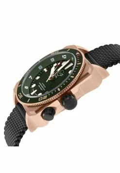 GV2 Men’s Swiss Quartz watch from the Marchese Collection44mm Octagon IPYG Case, White Dial with Day/Big Date/Disc with applied date frameSecond Hand Sub Dial, Push/Pull Gevril Logo CrownGenuine Green Italian Leather Strap with Deployment ClaspAnti-reflective Sapphire CrystalWater Resistant to 50 Meters/5ATMSwiss Quartz Movement Ronda 7004.P