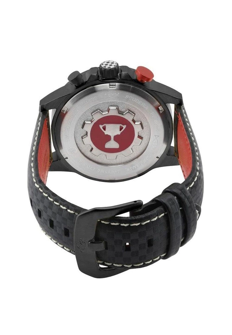 GV2βs sporting chronograph, Scuderia, is the perfect match for the high-octane performer. Inspired by Italian racing, Scuderia isnβt only fast-paced β its sleek, daring design catches your eye at any speed. A competition-ready crown replete with final lap flag pattern is just the start. The lower sub dial in finish line form seamlessly compliments the markers and tachymeter on the bezel β ideal for computing speeds down to split seconds. Echoing the sub dial, the carbon fiber print strap on genuine Italian leather with stitching is an inspired track detail not to be outshone by the engraved trophy on the back casing that makes Scuderia a winning look. Not only racy, Scuderia is equipped with GV2βs standard performance features: a 45mm round case in anti-reflective sapphire crystal, water resistant up to 100 meters and Swiss quartz multifunction movement that make this timepiece nearly indestructible. Feeling bold? Make moves with the Scuderia Collection.Specifications