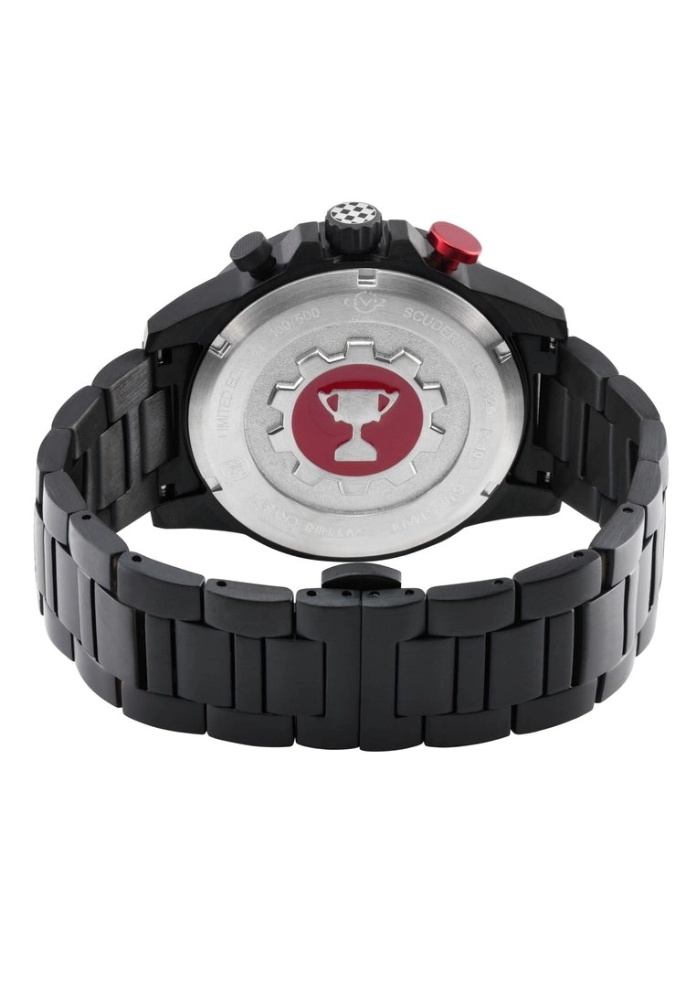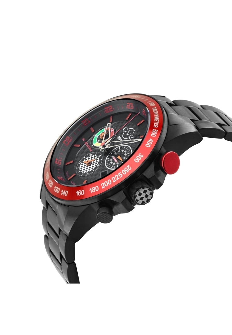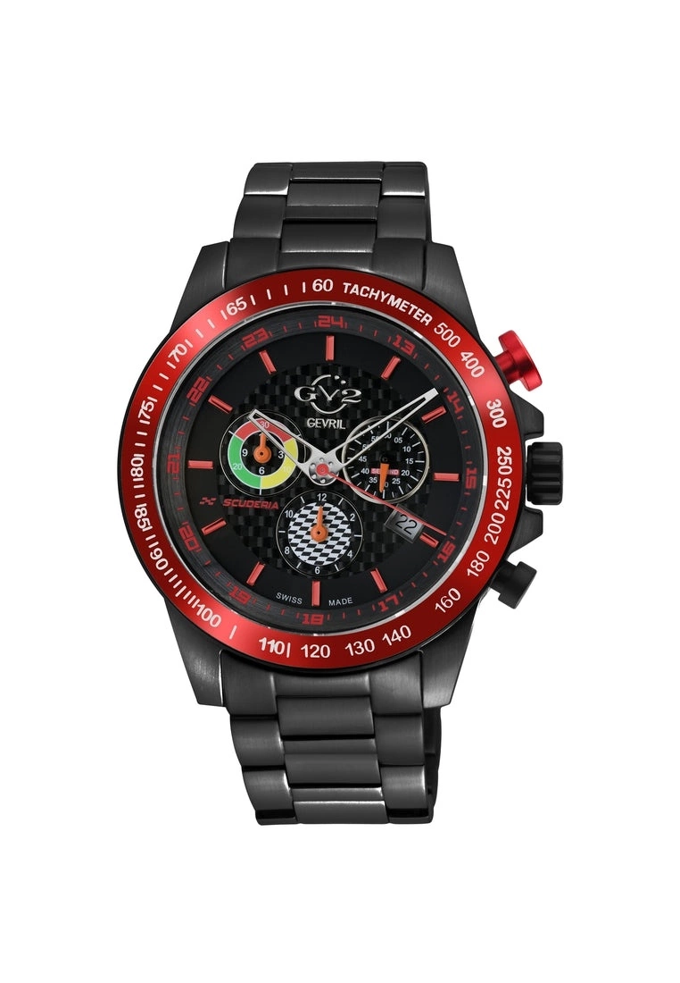 GV2βs sporting chronograph, Scuderia, is the perfect match for the high-octane performer. Inspired by Italian racing, Scuderia isnβt only fast-paced β its sleek, daring design catches your eye at any speed. A competition-ready crown replete with final lap flag pattern is just the start. The lower sub dial in finish line form seamlessly compliments the markers and tachymeter on the bezel β ideal for computing speeds down to split seconds. Echoing the sub dial, is an engraved trophy on the back casing that makes Scuderia a winning look. Not only racy, Scuderia is equipped with GV2βs standard performance features: a 45mm round case in anti-reflective sapphire crystal, water resistant up to 100 meters, 316L Stainless Steel Bracelet and Swiss quartz multifunction movement that make this timepiece nearly indestructible. Feeling bold? Make moves with the Scuderia Collection.SpecificationsGV2 9925B Men’s Scuderia Quartz Multifunction Chrono WatchGV2 Men’s Swiss Quartz Watch from the Scuderia Collection45mm Round 316L Stainless Steel Case, Multifunction Chronograph-Tachymeter scale, an alarm, an additional time zoneBlack Carbon Fiber Dial, Red MarkersSecond Sub Dial, Date Window at 4 O’clock316L Black Stainless Steel Bracelet with Deployment claspAnti-reflective Sapphire CrystalWater Resistant to 100 Meters/10ATMSwiss Quartz Multifunction Chrono, Ronda 5130D with Alarm