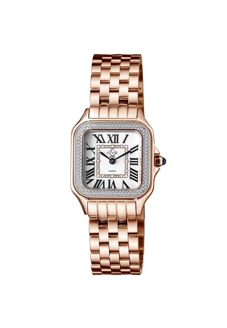 Each exquisite timepiece from the Milan Collection is a tribute to iconic, exceptional Italian fashion.SpecificationsGV2 12111B Women’s Milan Diamond Swiss Quartz WatchGV2 Women’s Swiss Watch from the Milan Collection27.5 mm Square IP Rose Gold Case/Push Pull Crown with Blue Cabochon StoneDiamond Cut Bezel, Crisp White Dial with 12 DiamondsIP Rose Gold Bracelet with Deployment BuckleAnti-reflective Sapphire CrystalWater Resistant to 50 Meters/5ATMSwiss Quartz Movement Ronda 762