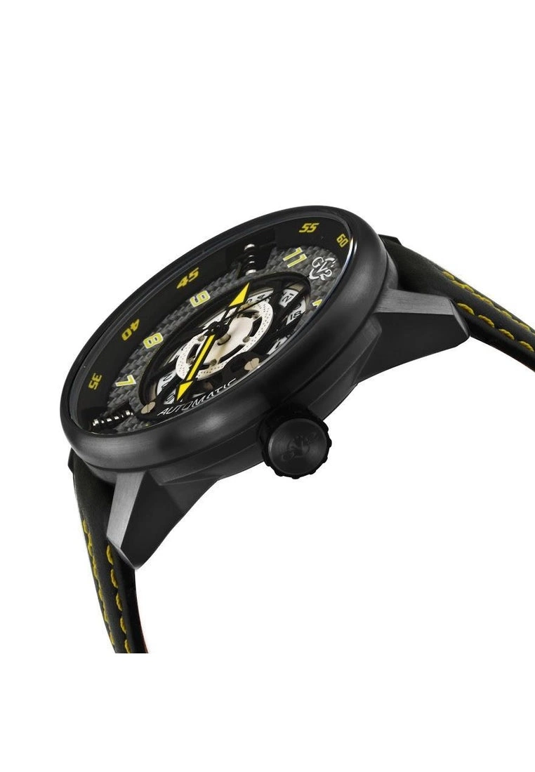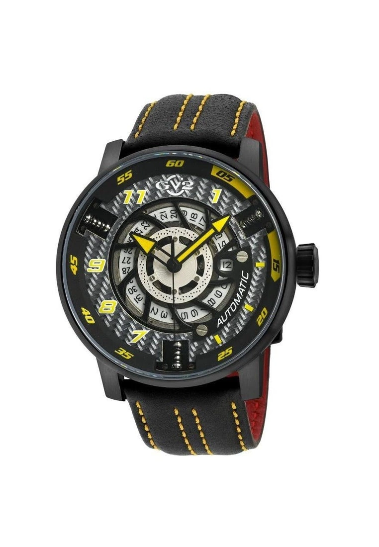 GV2 Swiss Automatic Movement Motorcycle Sport Collection48 mm Round IPBK Case, Black/White Dial, Screwed Down CrownThree Miniature Shock Absorbers at 2,6 and 10 o’clockDate Wheel, Colorful date Indicator, Luminous HandsGenuine Black Leather with Yellow Stitching Strap with Tang BuckleAnti-reflective Sapphire CrystalWater Resistant to 100 Meters/10ATMSwiss Automatic Mechanical MovementÂ