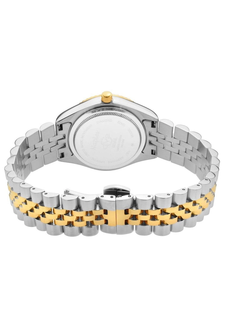 The mother of pearl dial includes 11 inlaid single cut diamonds in a square gold setting for a glittering effect, offset by the textured pattern around the bezel. The round case includes a push pull crown and magnified date, available in rose gold, silver or gold. Covered in anti-reflective sapphire and water resistant up to 50 meters, this resilient watch features precision Swiss Quartz movement. Choose from the romantic rose gold, timeless stainless steel or luxe yellow gold elegant deployment buckle and bracelet. Graceful and sophisticated, the Naples Collection defines iconic, Italian accessory design.SpecificationsGV2 12406 Women’s Naples Swiss Diamond WatchGV2 Women’s Swiss Watch from the Naples Collection34mm Round Silver case, Fluted Gold BezelBlue dial with 11 Single Cut Diamonds on dialMagnified Date, push pull crownIP Two Toned SS IP Yellow Gold Bracelet with Deployment BuckleAnti-reflective Sapphire Crystal5 ATM (50 Meters 165 Feet)Swiss Quartz Movement Ronda 705