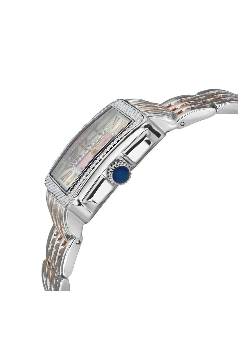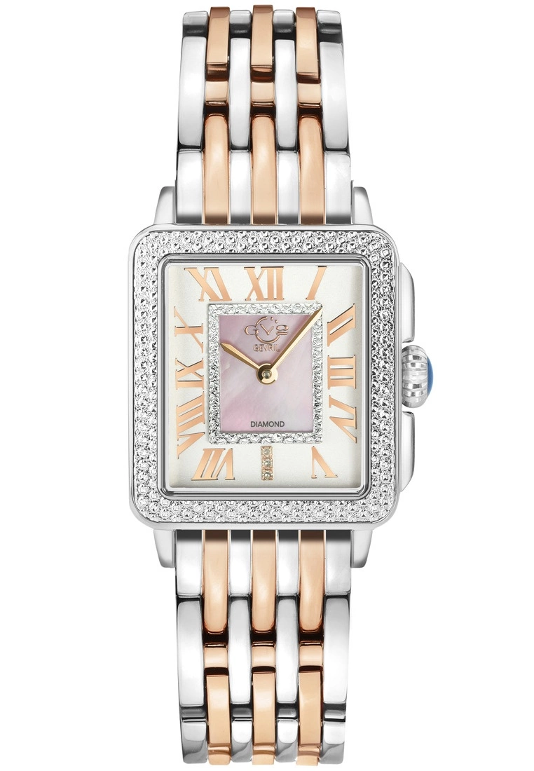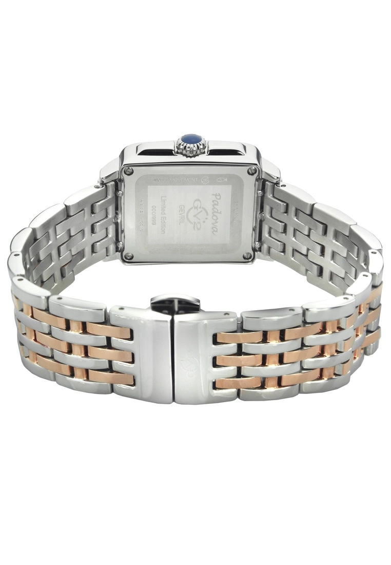GV2 Women’s Swiss Watch from the Padova Collection27.5 mm Rectangle Silver case, push pull crownStunning Pink MOP dial with Diamond Cut ring on dial, 3 Diamonds at 6.00316L Stainless Steel Two toned IP Rose Gold Bracelet with Deployment BuckleAnti-reflective Sapphire CrystalWater Resistant to 30 Meters/3ATMSwiss Movement Ronda 762