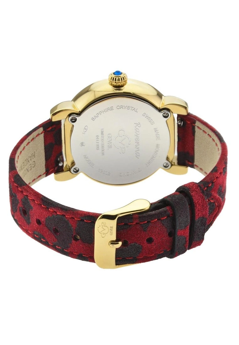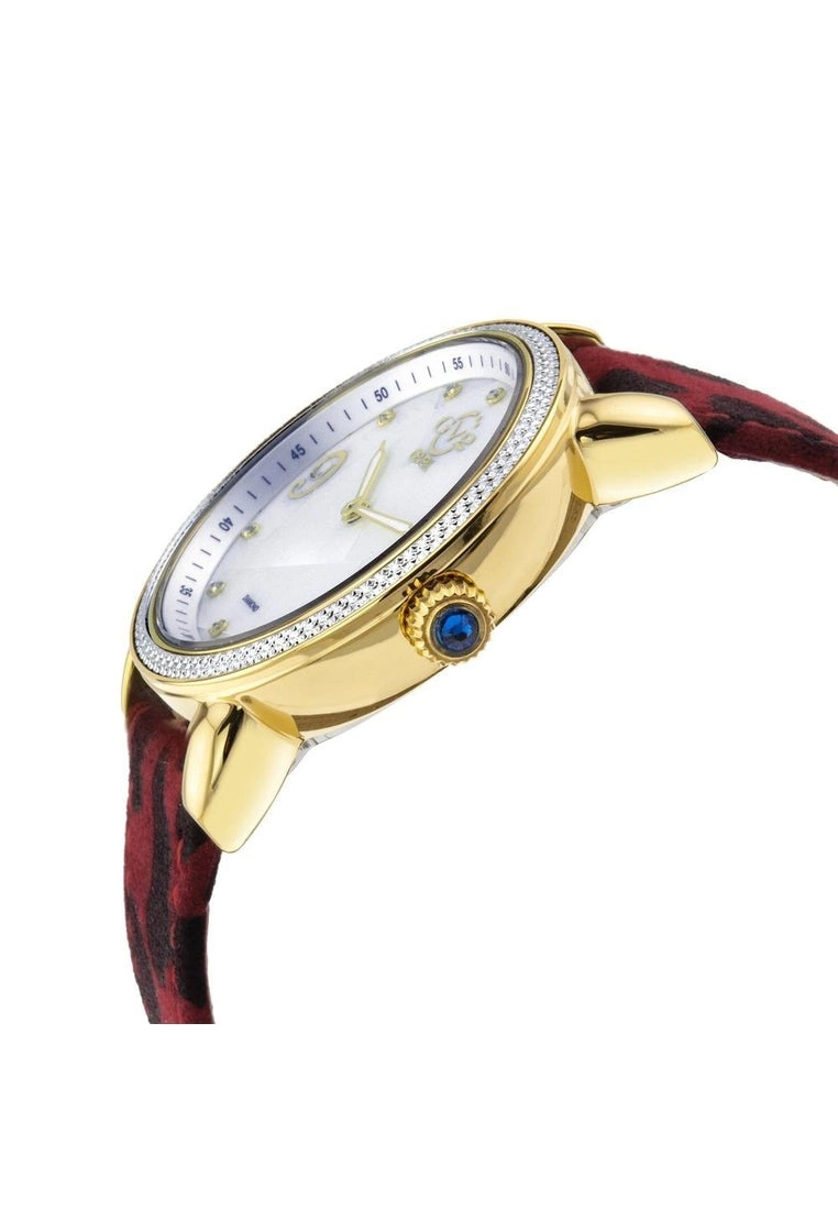 GV2 Women’s Swiss Quartz Watch from the Ravenna Collection37mm round 18K Yellow Gold Ion Plating CaseMOP White Mosaic Dial, 11 Diamonds on DialPush Pull Fluted Crown with Blue Cabochon StoneAnimal Print Suede Handmade Italian Strap with Tang BuckleAnti-reflective Sapphire CrystalWater Resistant to 50 Meters/5ATMSwiss Quartz Movement, Ronda 762