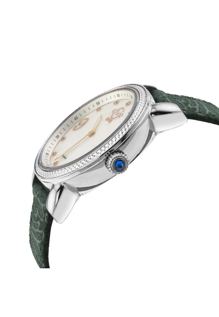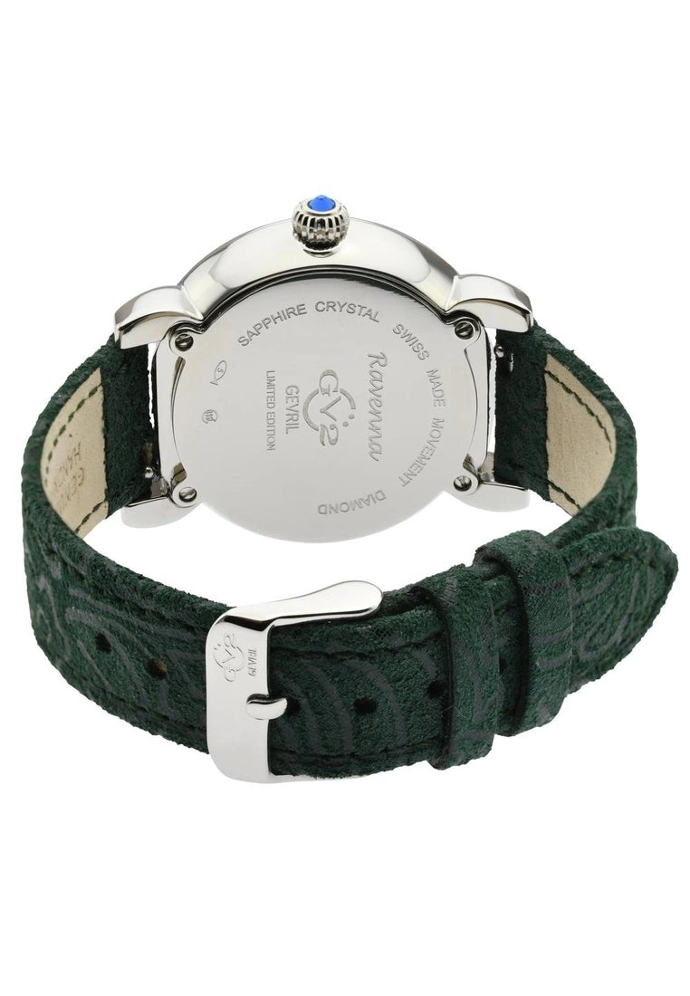 GV2 Women’s Swiss Quartz Watch from the Ravenna Collection37mm round 316L Stainless Steel Case, Silver BezelMOP White Mosaic Dial, 11 Diamonds on dialPush Pull Fluted crown with Blue cabochon StoneEmbossed Green Suede Handmade Italian Strap with Tang BuckleAnti-reflective Sapphire CrystalWater Resistant to 50 Meters/5ATMSwiss Quartz Movement, Ronda 762