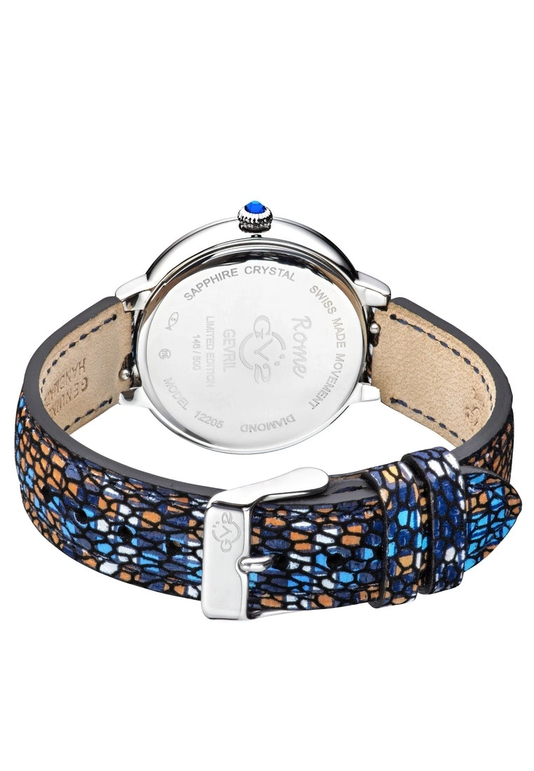 The Rome Collection by GV2 captures the renowned beauty of its namesake city through a series of classic, sophisticated timepieces. Swiss-made quartz excellence and an authentic, artful Italian design combine for an illustrious collection of distinctive watches. The graceful bezel circles a bright white dial, embedded with 12 diamonds, punctuated with iconic roman numerals. A regal blue cabochon stone accents the interior of the push pull fluted crown. Compliment wrists with delicate, streamlined gold and stainless steel bracelet with a deployment buckle. The Rome Collection by GV2 elegantly balances heritage with sleek, modern design.SpecificationsGV2 12205S Women’s Rome Diamond Swiss Quartz WatchGV2 Women’s Swiss Watch from the Rome Collection36 mm Round Silver Case/Push Pull Fluted crown with Blue cabochon StoneBeautiful bright Navy dial with 12 Diamond on dialGenuine Italian Blue Multicolor Leather Strap with Tang BuckleAnti-reflective Sapphire CrystalWater Resistant to 30 Meters/3ATMSwiss Quartz Movement Ronda 1069