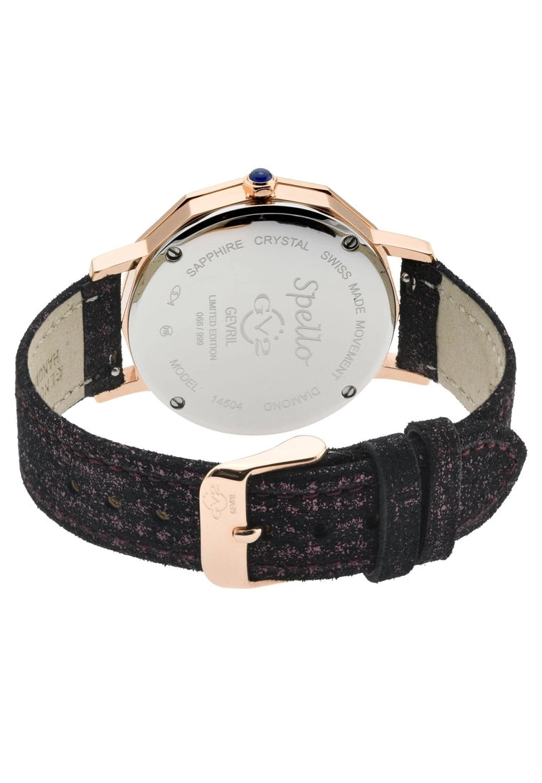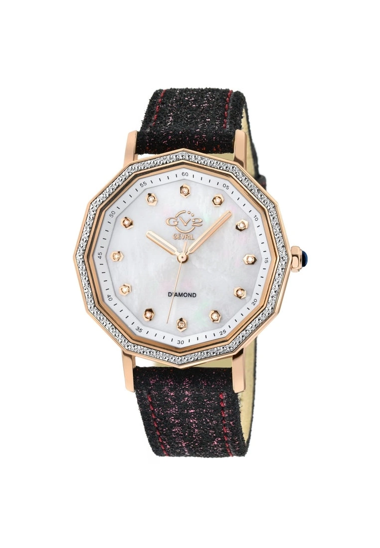 GV2 Women’s Spello Genuine Diamond Watch38mm Dodecagon IPRG Case, Diamond cut Bezel12 Diamonds on MOP White DialPush Pull Fluted Crown with Blue Cabochon StoneGenuine Italian Purple Suede Strap with Tang BuckleAnti-reflective Sapphire CrystalWater Resistant to 30 Meters/3ATMSwiss Quartz Movement Ronda 763