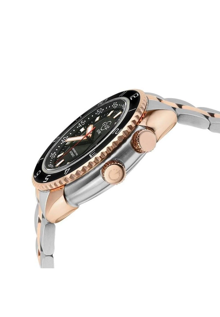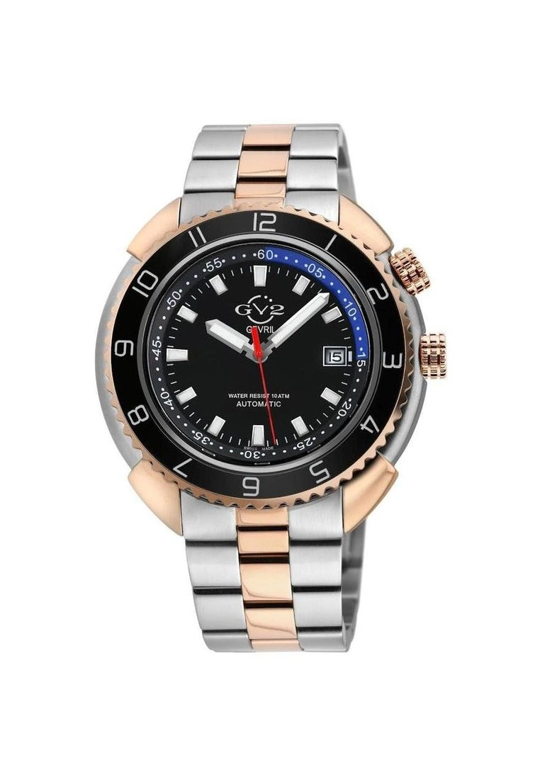 GV2 Men’s Swiss Automatic from the Squalo Collection46mm Round Two Tones SS IPRG Lug embraced Case, Ceramic BezelMain Crown Screw down, Second Crown Inner Rotating BezelBlack Dial Luminous Hands and Hour Markers, Date at 3 o’clockTwo-toned SS IPRG Bracelet With Deployment BuckleAnti-reflective Sapphire CrystalWater Resistant to 100 Meters/10ATMSwiss Automatic MovementÂ