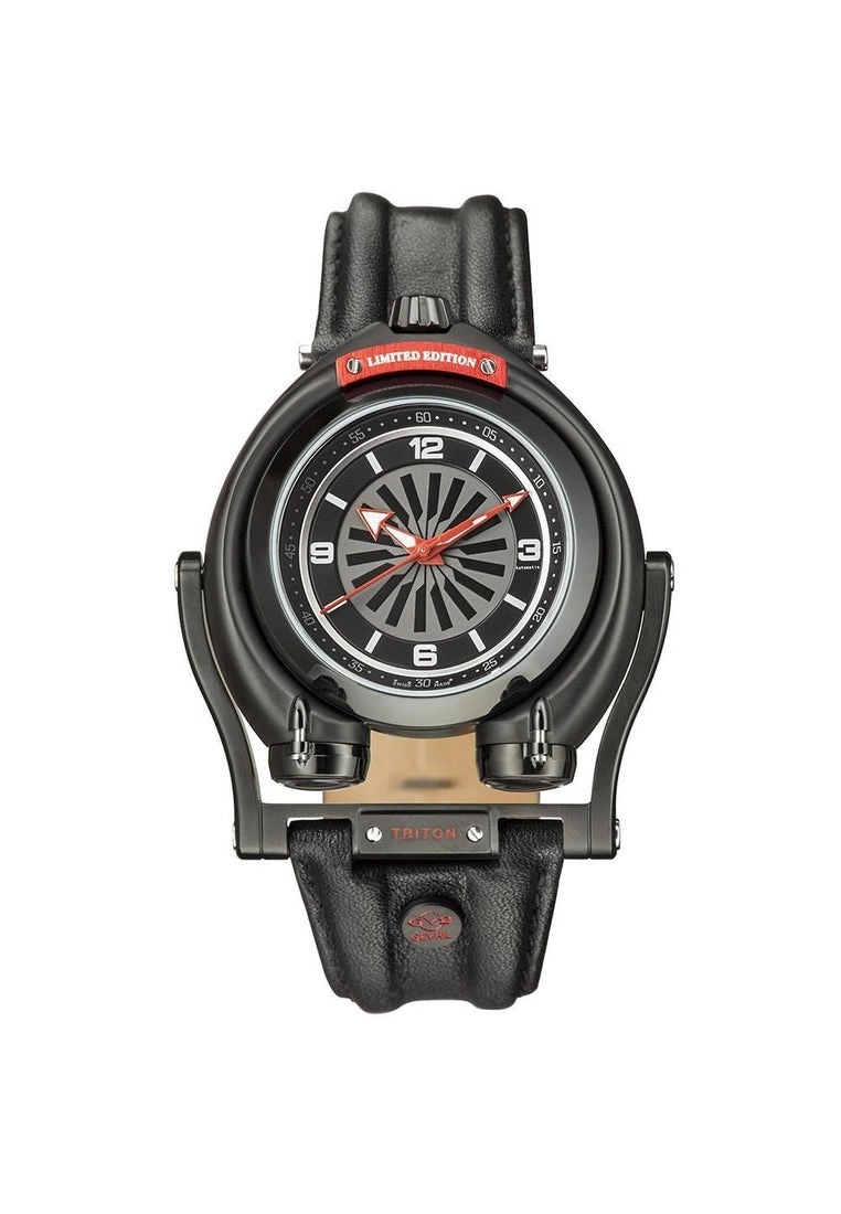 GV2 Swiss Automatic Movement Triton Collection48 mm Round Gun Metal Case/Black Dial/White Index, Screw down crownPrecision Twin spinning Rotors Mounted on side of the caseSwinging lower lugs and rotating turbine visible on case backCalfskin Black Leather Strap with Tang BuckleAnti-reflective Sapphire CrystalWater Resistant to 50 Meters/5ATMSwiss Automatic Mechanical Movement