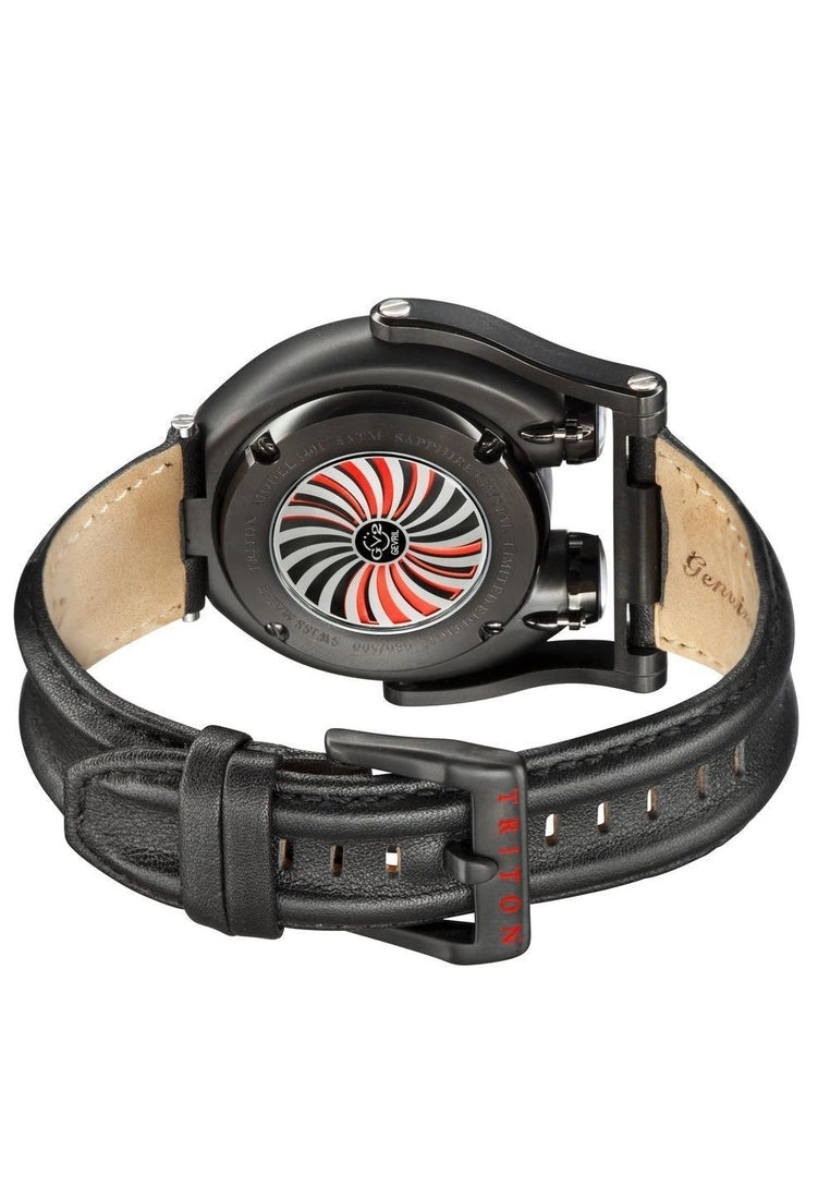 At the time she was commissioned in 1959, the Triton was the largest, most powerful, and most expensive submarine ever built. It’s not surprising that this ship’s namesake is equally impressive. With a submarine inspired 48 mm case and style all its own, the masculine Triton is perfect for someone who wants to make a big statement. Unique marine detailing defines this superlative, Swiss Made automatic timepiece. From the precision twin spinning rotors mounted on the side of the case, to the swinging lower lugs and rotating turbine visible on the case back, this watch is designed to catch people’s attention.Specifications