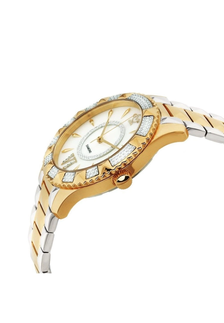 GV2 Women’s Swiss Watch from the Venice Collection39 mm Round Rose Gold Case/Push Pull CrownDiamond Cut Bezel, 8 Diamonds on Indices 6Two toned Rose Gold-Stainless Steel Bracelet with Deployment BuckleAnti-reflective Sapphire CrystalWater Resistant to 50 Meters/5ATMSwiss Quartz Movement Ronda 763