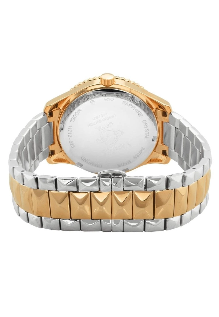 Perfected Swiss craftsmanship inspired by iconic Italian design. The Venice Collection by GV2 embodies the poetic beauty and notable fashion of Venice, Italy. Adorn wrists in this stunning series of diamond quartz timepieces. Ion-plated gold and stainless steel bands glint off the round, diamond cut bezel. Enchanting details, like six diamond inlays surrounding a sapphire face, delicately juxtapose a geometric bracelet. Classic yet stylish, the Venice Collection captures the beauty and romance of its namesake.Specifications