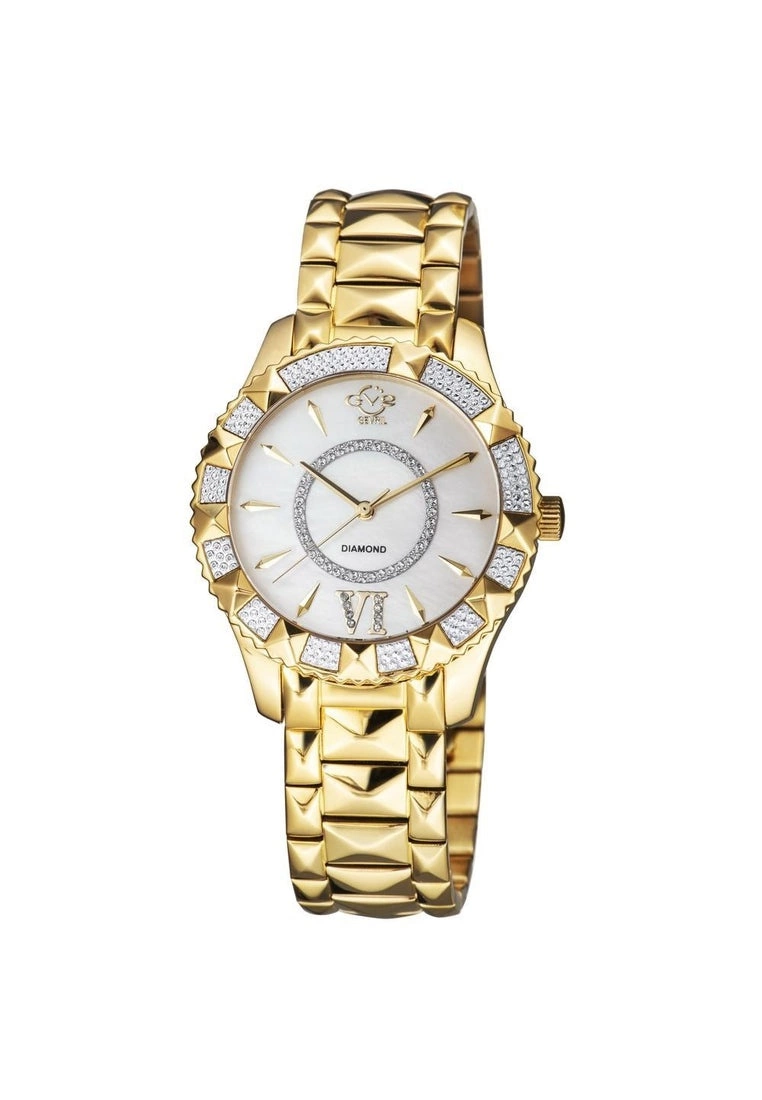 GV2 Swiss Watch from the Venice Collection39 mm IP Yellow Gold Case/Push Pull CrownDiamond Cut Bezel, White MOP Dial, 8 Diamonds on Indice 6IP Yellow Gold Bracelet with Deployment BuckleAnti-reflective Sapphire CrystalWater Resistant to 50 Meters/5 ATMSwiss Quartz Movement Ronda 763