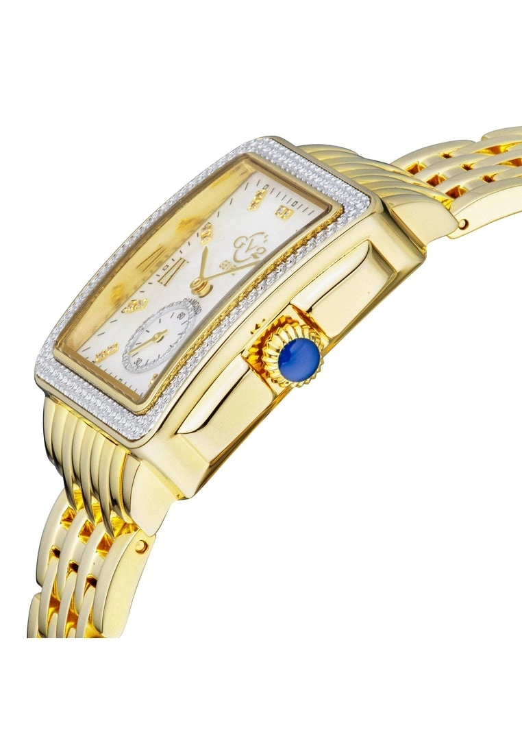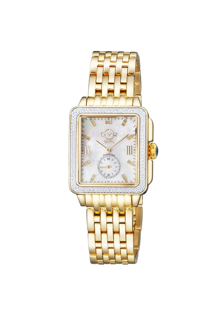 GV2 Women’s Swiss Watch from the Bari Collection37mm Square IPYG Diamond Cut Bezel Case/ Push Pull CrownWhite MOP dial with 18 Diamonds Single Cut G/H ColorSecond Hand Sub DialIPYG Stainless Steel Bracelet with Deployment BuckleAnti-reflective Sapphire CrystalWater Resistant to 30 Meters/3ATM