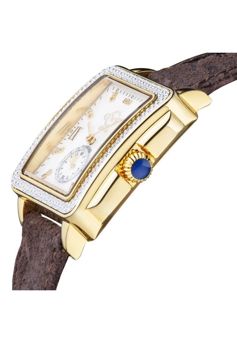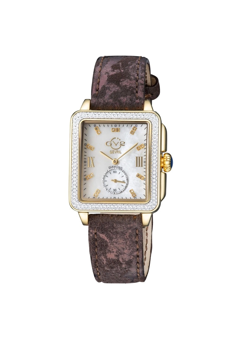 GV2 Women’s Swiss Watch from the Bari Collection37mm Square IPYG Diamond Cut Bezel Case/ Push Pull CrownWhite MOP dial with 18 diamonds Single Cut G/H ColorSecond Hand Sub DialGenuine Handmade Italian Brown Strap with Tang BuckleAnti-reflective Sapphire CrystalWater Resistant to 30 Meters/3ATM