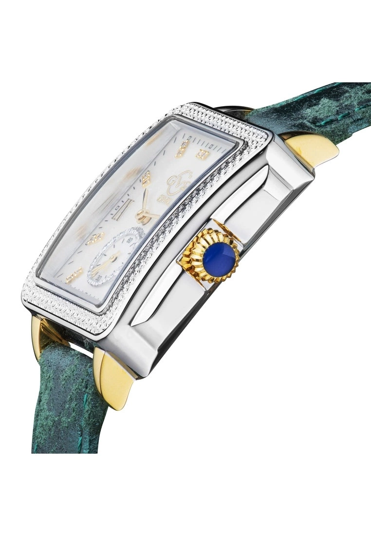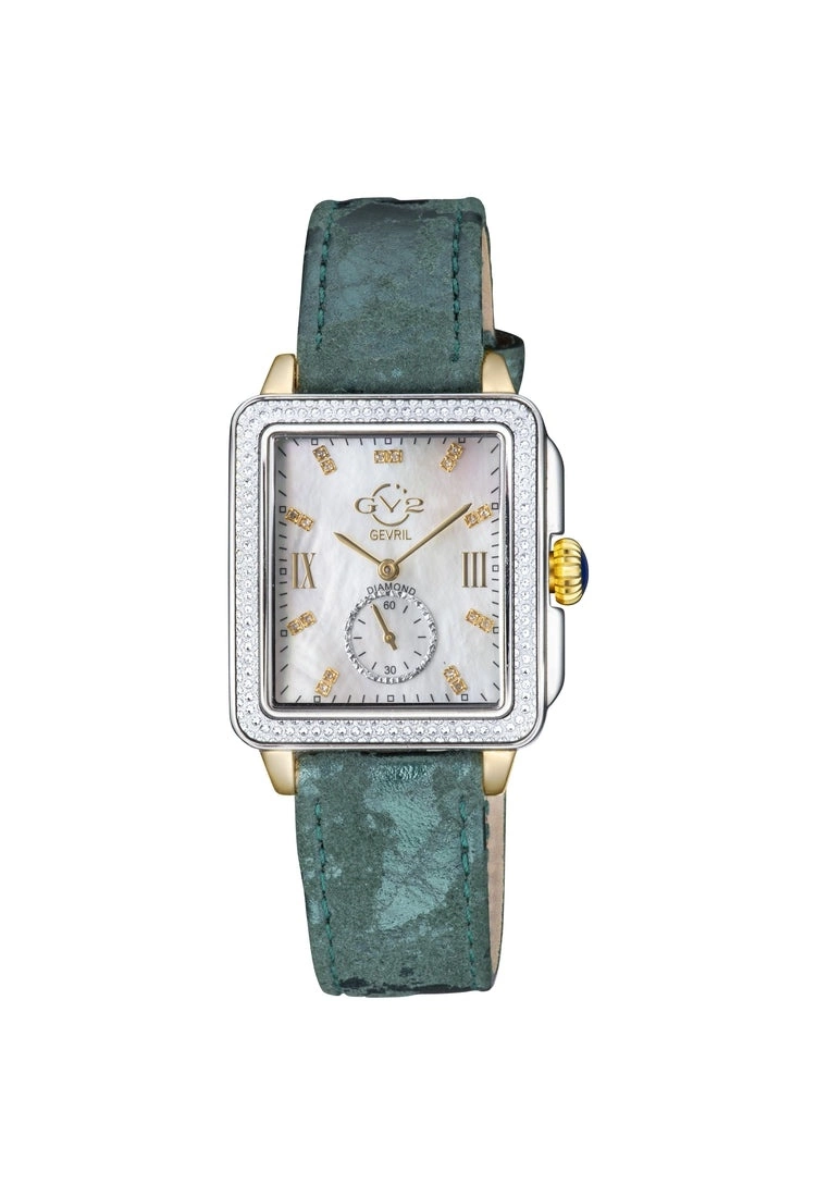 GV2 Women’s Swiss Watch from the Bari Collection37mm Square Silver Diamond Cut Bezel Case/ Push Pull CrownWhite MOP dial with 18 diamonds Single Cut G/H ColorSecond Hand Sub DialGenuine Handmade Italian Green Strap with Tang BuckleAnti-reflective Sapphire CrystalWater Resistant to 30 Meters/3ATM