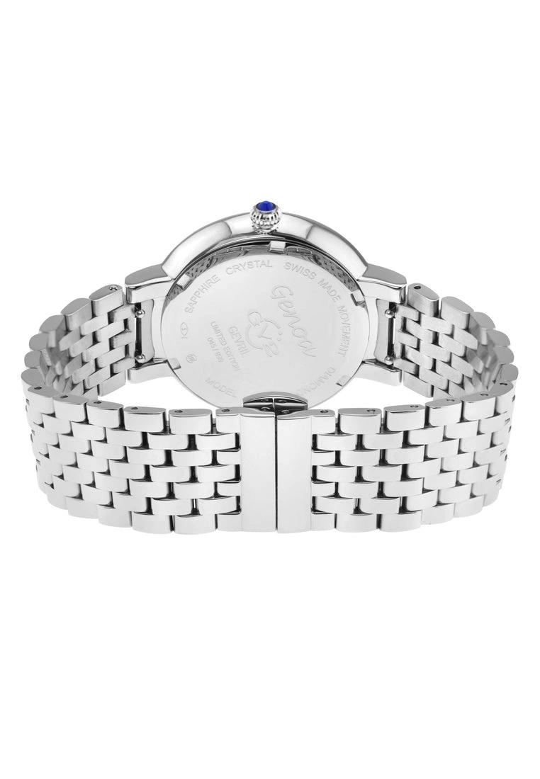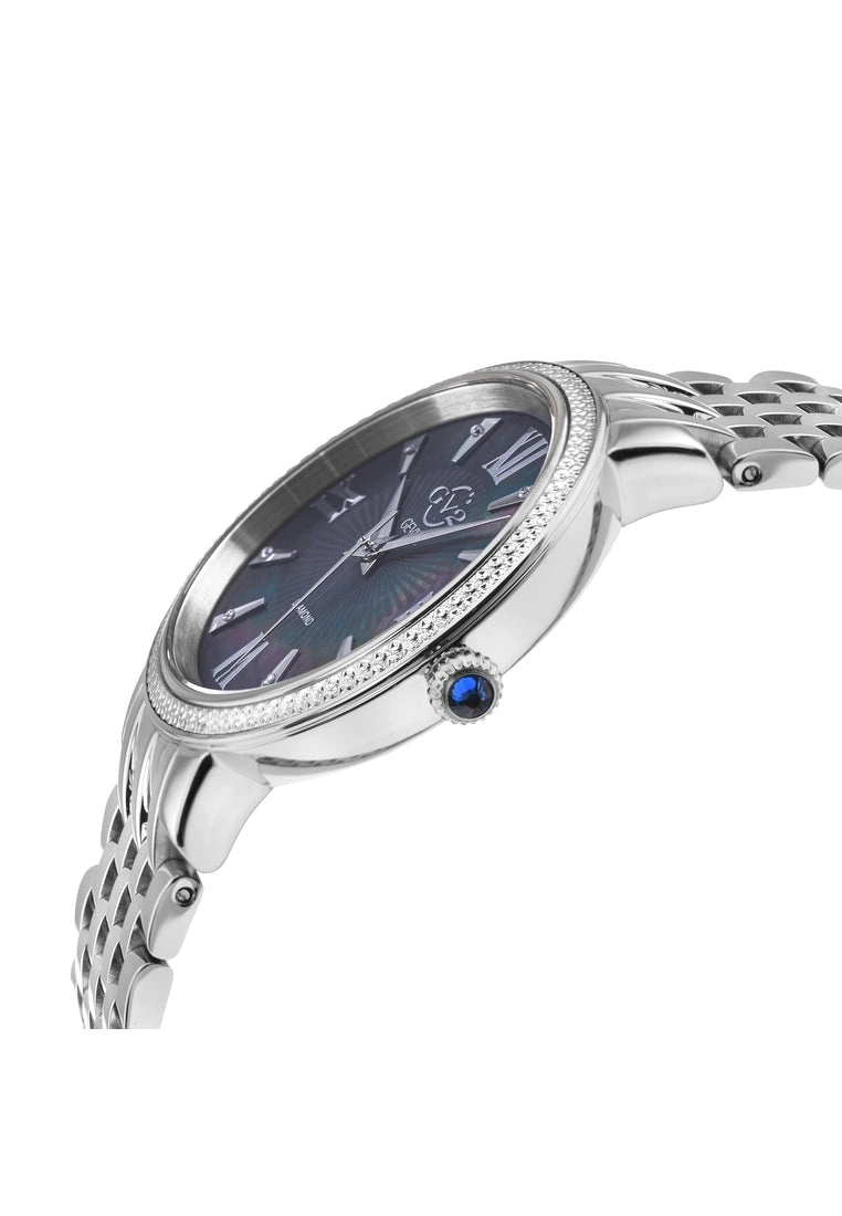 GV2 Women’s Swiss Quartz Watch from the Genoa Collection37mm Round Silver Case, Black MOP DialDiamond Cut Bezel, 8 Diamonds on DialPush Pull Crown with Blue Cabochon Stone316L Stainless Steel Bracelet with Deployment BuckleAnti-reflective Sapphire CrystalWater Resistant to 50 Meters/5ATMSwiss Quartz Movement Ronda 763
