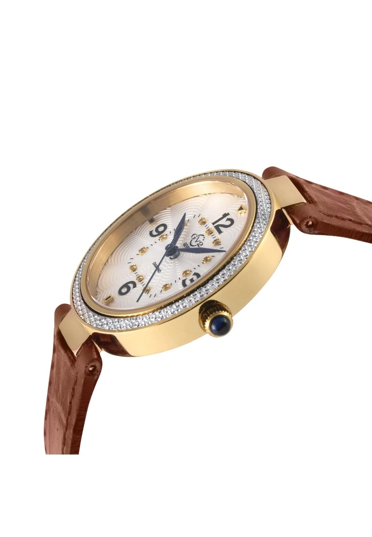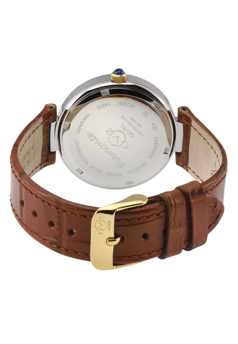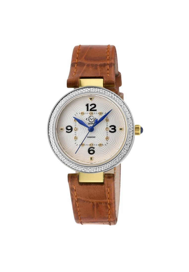Gevril GV2 Women’s Piemonte Stainkess Steel Case, White dial, Diamond Watch, Genuine Handmade Italian Brown Leather Strap