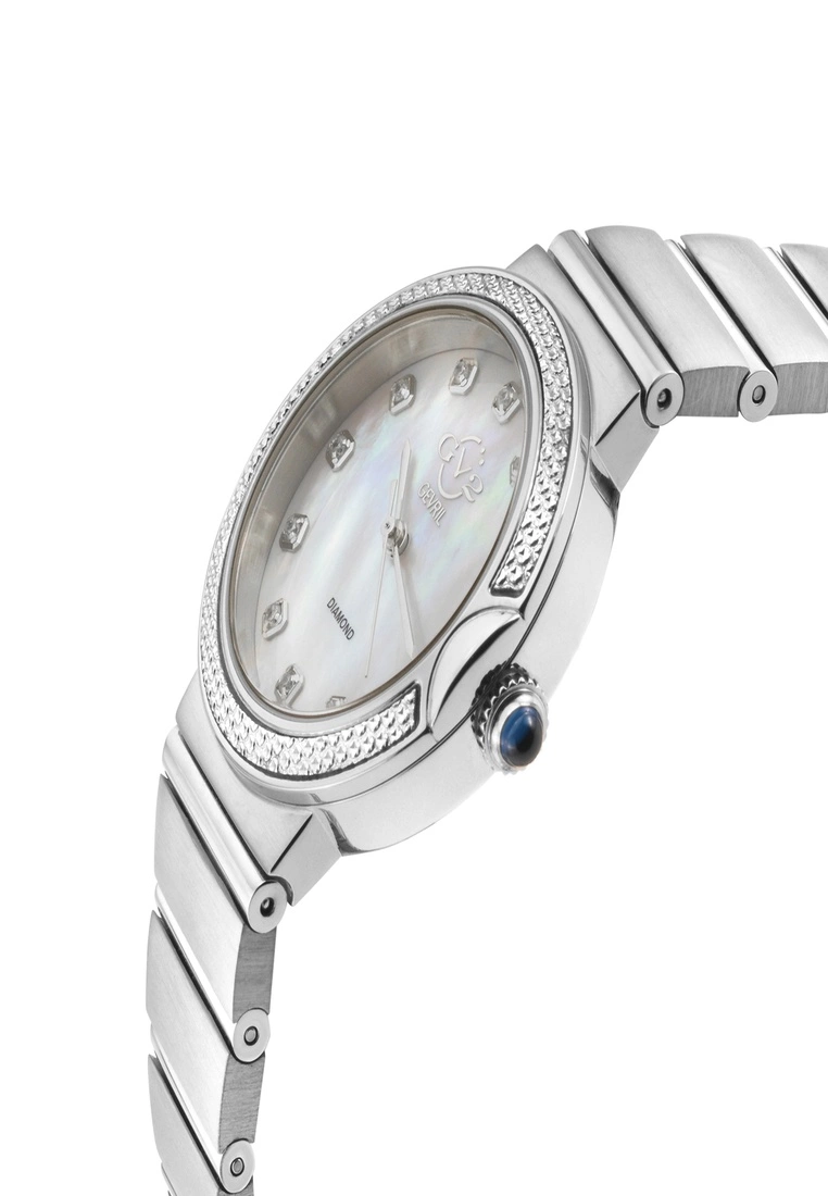 GV2 Women’s Swiss Diamond Watch from the Sorrento Collection33mm Round 316L Stainless Steel case. IPSS Diamond Cut BezelWhite MOP Dial, 12 DiamondsPush/Pull Silver Crown316L Stainless Steel Bracelet with Deployment BuckleAnti-reflective Sapphire Crystal5 ATM (50 Meters 165 Feet)Swiss Quartz Movement Ronda 763