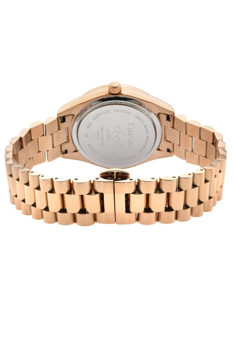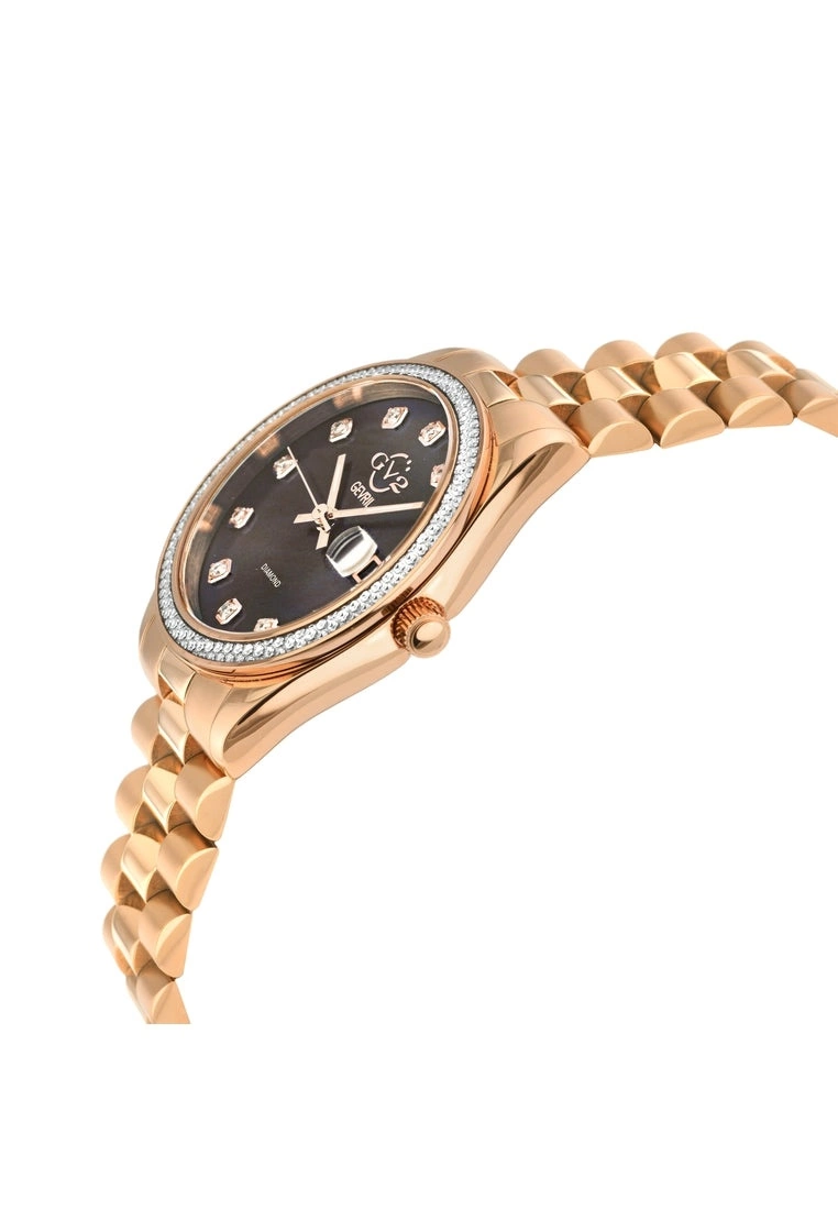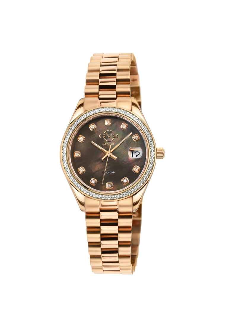 GV2 Women’s Swiss Watch from the Turin Collection36mm Two toned Stainless Steel IPRG Diamond Cut Bezel CaseChocolate Brown MOP Dial with 11 DiamondsMagnified Date at 3 O’clock, Push/Pull CrownTwo-Toned SS IP Rose Gold Bracelet With Deployment BuckleAnti-reflective Sapphire Crystal5 ATM (50 Meters 165 Feet)Swiss Quartz Movement Ronda 705