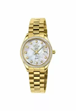 Mother-of-Pearl Dials in assorted colors accented with 11 Diamonds surrounded by a Stainless Steel Cut Bezel Case call to mind the influence of royalty, business and culture. With Swiss Quartz Movement Ronda Caliber 705, the Turin Collection is durable enough for a day on the slopes, yet perfecto for après-ski or a glass of vino at a gallery opening. Ciao Bella.SpecificationsGV2 12422B Women’s Turin Swiss Diamond WatchGV2 Women’s Swiss Watch from the Turin Collection36mm Stainless Steel IPYG Diamond Cut Bezel CaseWhite MOP Dial with 11 DiamondsMagnified Date at 3 O’clock, Push/Pull CrownIP Yellow Gold Bracelet With Deployment BuckleAnti-reflective Sapphire Crystal5 ATM (50 Meters 165 Feet)Swiss Quartz Movement Ronda 705