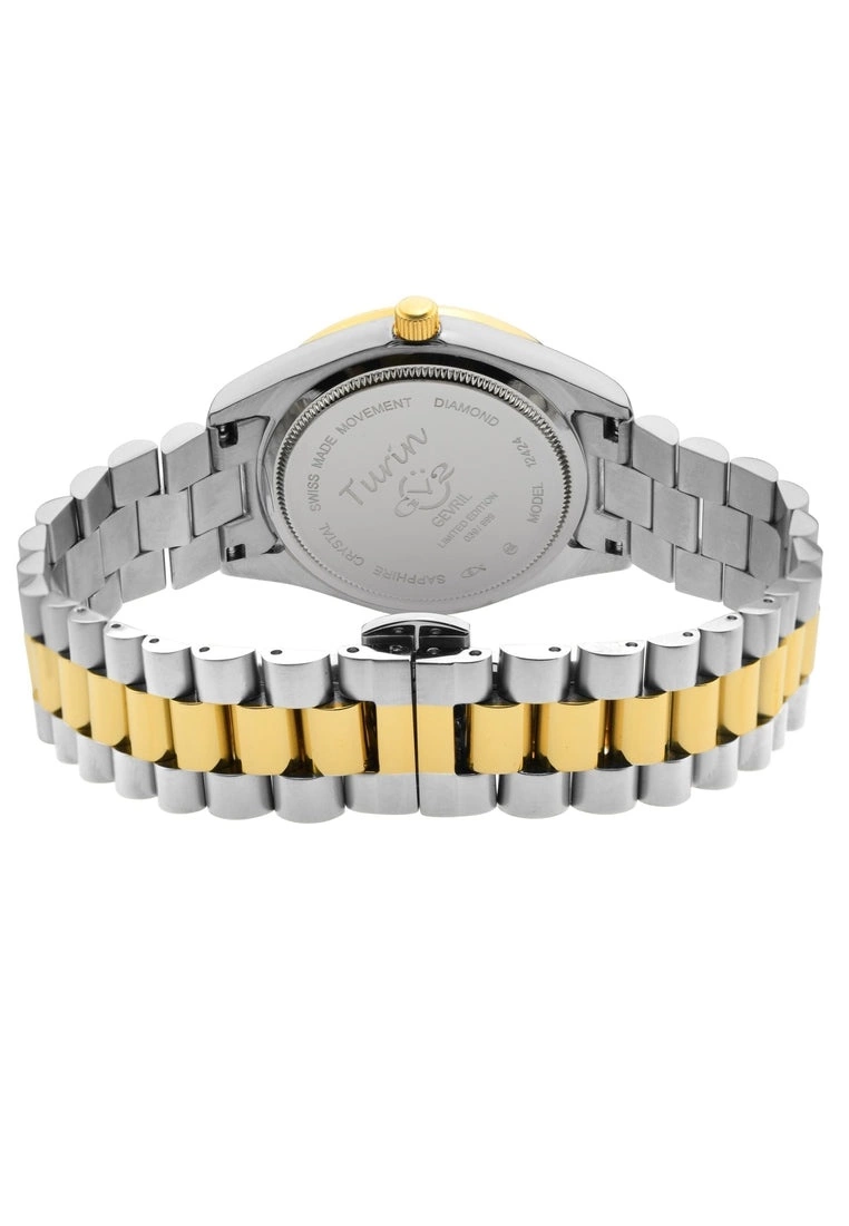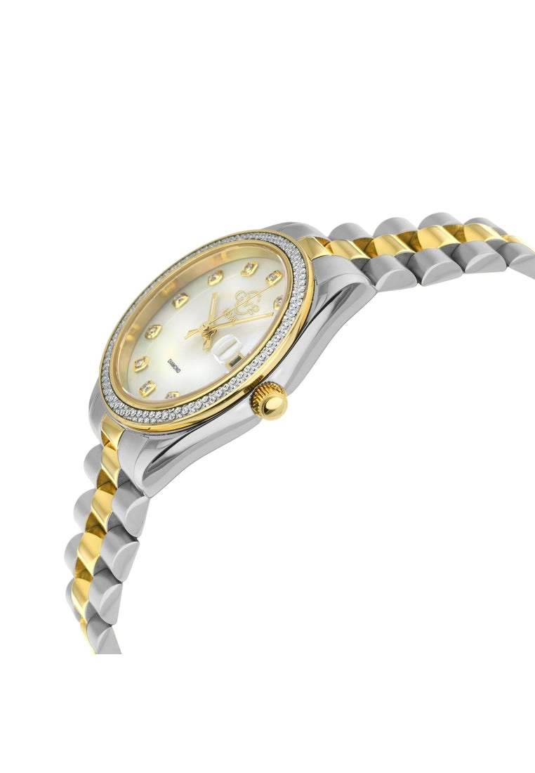 Mother-of-Pearl Dials in assorted colors accented with 11 Diamonds surrounded by a Stainless Steel Cut Bezel Case call to mind the influence of royalty, business and culture. With Swiss Quartz Movement Ronda Caliber 705, the Turin Collection is durable enough for a day on the slopes, yet perfecto for après-ski or a glass of vino at a gallery opening. Ciao Bella.SpecificationsGV2 12424B Women’s Turin Swiss Diamond WatchGV2 Women’s Swiss Watch from the Turin Collection36mm Two toned Stainless Steel IPYG Diamond Cut Bezel CaseWhite MOP Dial with 11 DiamondsMagnified Date at 3 O’clock, Push/Pull CrownTwo-Toned SS IP Yellow Gold Bracelet with Deployment BuckleAnti-reflective Sapphire Crystal5 ATM (50 Meters 165 Feet)Swiss Quartz Movement Ronda 705