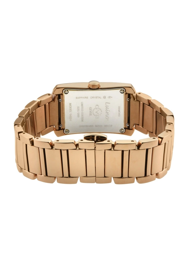 Diamond Cut ring Center, 12 Diamonds on DialPush/Pull CrownIP Rose Gold Bracelet With Deployment BuckleAnti-reflective double curved Sapphire CrystalWater Resistant to 50 Meters/5ATMSwiss Quartz Movement Ronda 762