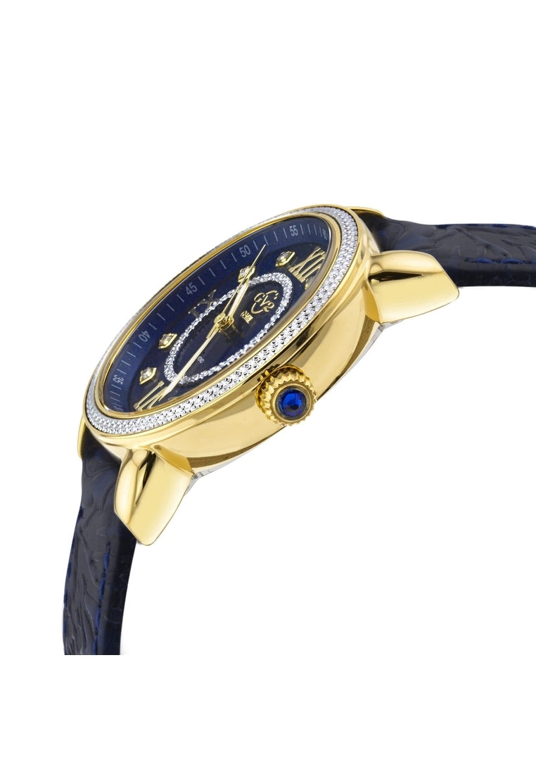 The spectacular GV2 Marsala Collection has it all. This exquisitely crafted ladies Diamond watch has captured the essence of its picturesque Sicilian coastal namesake with a skillful blend of Italian inspired design and Swiss craftsmanship. The 37 mm Marsala features 9 sparkling diamonds as indices, a lustrous genuine mother of pearl dial, and a sapphire crystal to prevent scratches. To complete the inspired design, an intricate Tortoise bezel case and a fluted setting crown is capped with a beautiful translucent blue gemstone.SpecificationsGV2 9862 Women’s Marsala Swiss Quartz Diamond WatchGV2 Women’s Swiss Quartz Watch from the Marsala Collection37mm IP Gold Case, Diamond Cut BezelBlue MOP Dial with 8 DiamondsPush Pull Fluted Crown with Blue Cabochon StoneGenuine Red Embossed Leather Strap with Tang BuckleAnti-reflective Sapphire CrystalWater Resistant to 50 Meters/5ATMSwiss Quartz Movement Ronda 763