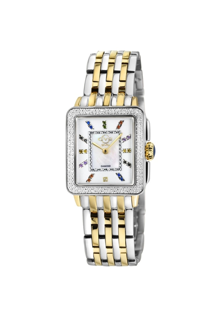 GV2 Women’s Swiss Watch from the Padova Gemstones Collection28.5 mm Rectangle Silver case, push pull crownStunning Silver White/White MOP dial with Diamond Cut ring on dial22 Multicolored Gemstones/1 diamond on dialTwo-Toned SS IP Yellow Gold Bracelet with Deployment BuckleAnti-reflective Sapphire CrystalWater Resistant to 30 Meters/3ATMSwiss Quartz Movement Ronda 762