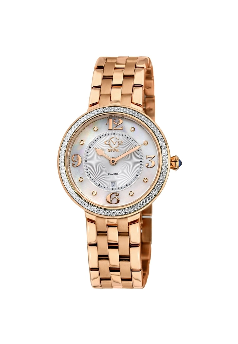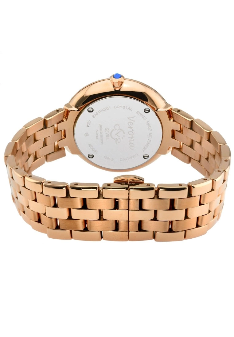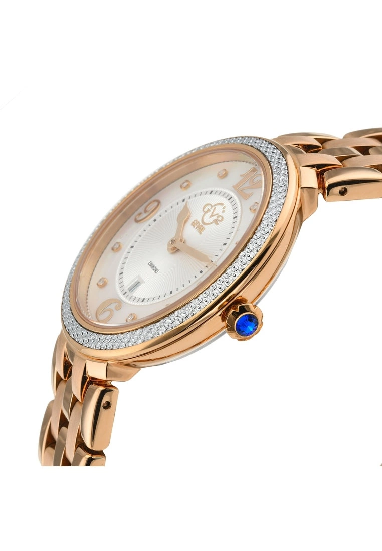 GV2 Women’s Swiss Quartz Watch from the Verona Collection37mm Rose Gold Diamond Cut Bezel Case8 Diamonds on White MOP Dial, Rose IndicesPush Pull Fluted Crown with Blue Cabochon StoneIP Rose Gold Bracelet With Deployment BuckleAnti-reflective Sapphire CrystalWater Resistant to 50 Meters/5ATMSwiss Quartz Movement Ronda 784