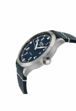 Gevril Men’s Swiss Automatic Watch from the Ascari Collection43mm 316L Stainless Steel Black Case with Forged Carbon Black Bezel, Blue Pattern DialArabian Raised Numerals, Luminous handsScrew down Crown with Gevril LogoDate at 3 o’clock, Exhibition case back316L Stainless Steel Black Satin and Polished Bracelet with Deployment BuckleAnti-reflective Sapphire CrystalWater Resistant to 100 Meters/10ATMSwiss Automatic, SW220 Movement
