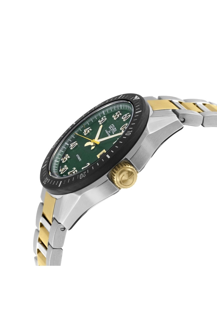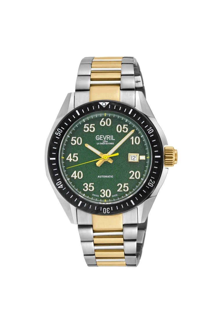 Gevril Men’s Swiss Automatic Watch from the Ascari Collection43mm 316L Stainless Steel Case with Forged Carbon Black Bezel, Green Pattern DialArabian Raised Numerals, Luminous handsScrew down Crown with Gevril LogoDate at 3 o’clock, Exhibition case back,316L Stainless Steel Satin and Polished Bracelet Two toned IPRG Deployment BuckleAnti-reflective Sapphire CrystalWater Resistant to 100 Meters/10ATMSwiss Automatic, SW220 Movement