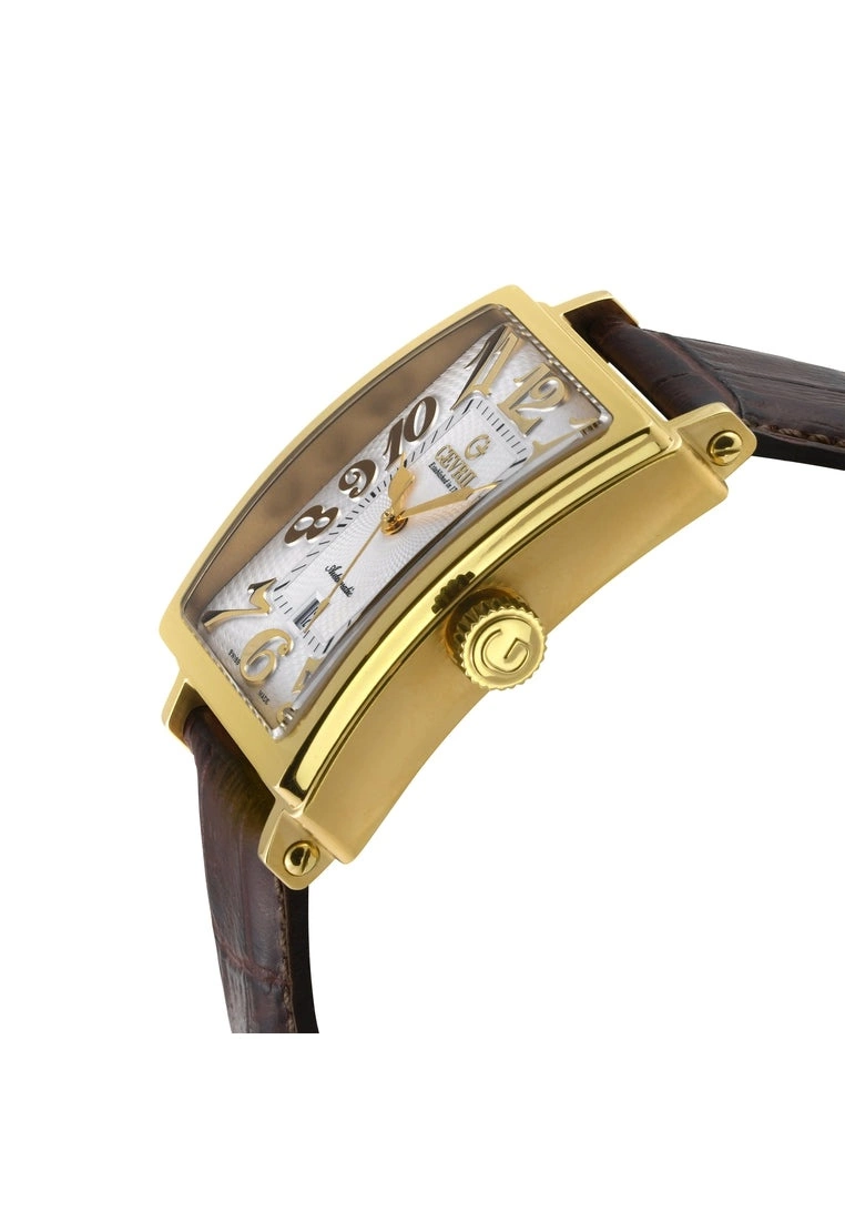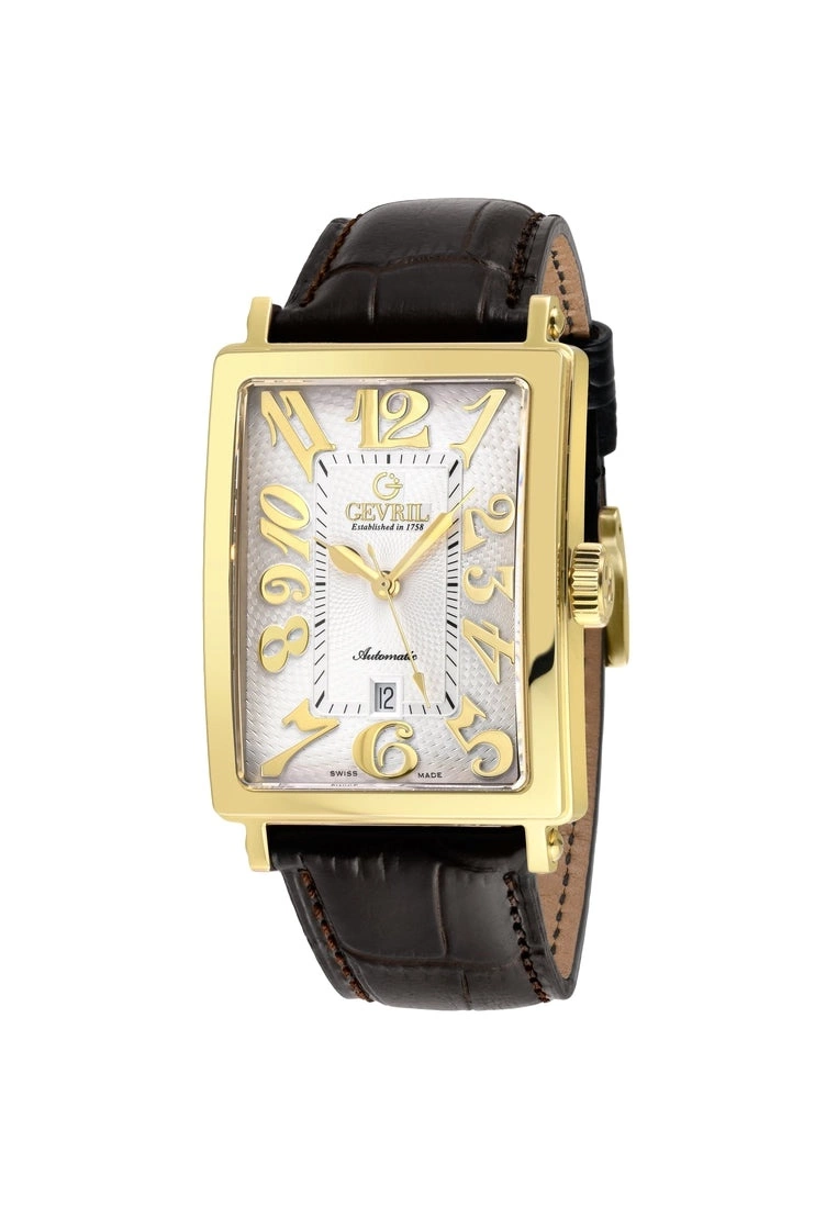 Gevril Men’s Avenue of America’s 15100-6 Swiss Automatic IP Yellow Gold White dial, Genuine Dark Brown Leather Band