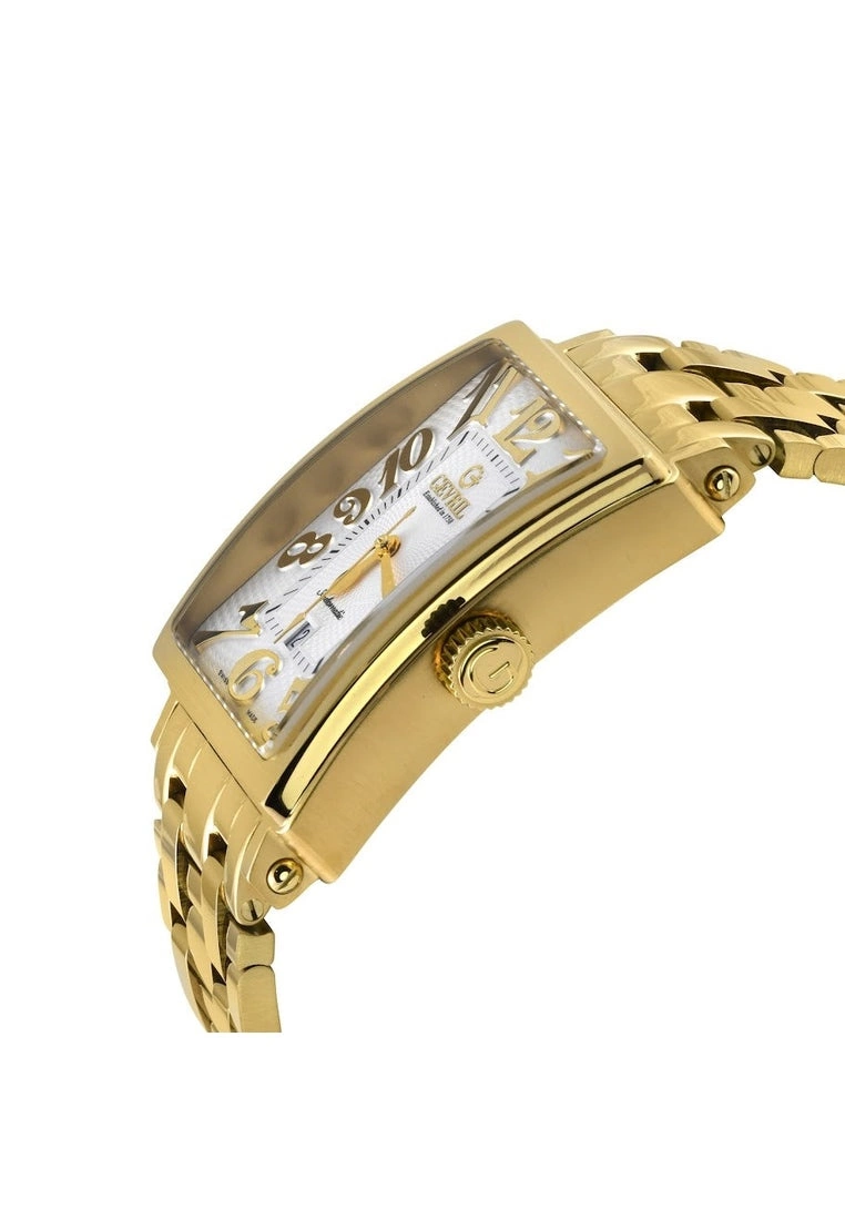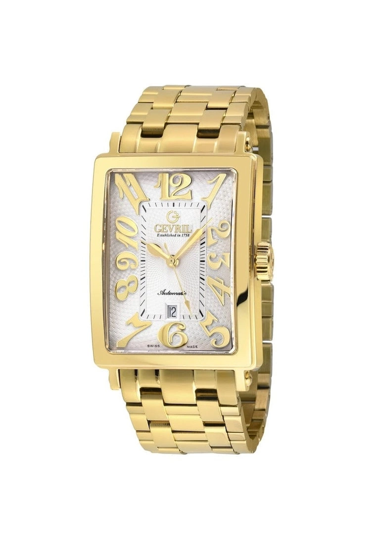 SpecificationsGevril 15100B Men’s Avenue of America Swiss Automatic WatchGevril Men’s Swiss Watch from the Avenue of Americas Collection44mm Rectangle IPYG Case, White Dial, Screw Down CrownDate at 6 o’clockIPYG Bracelet with folding Deployment BuckleAnti-reflective Sapphire CrystalWater Resistant to 50 Meters/5ATMSwiss Made Automatic, Sellita SW200 Movement