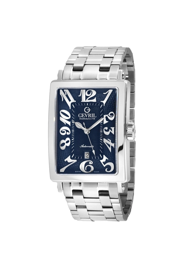 Gevril Men’s Swiss Watch from the Avenue of Americas Collection44mm Rectangle 316L Stainless Steel Case, Blue Dial, Screw Down CrownDate at 6 o’clock316L Stainless Steel Bracelet with Deployment clasp
