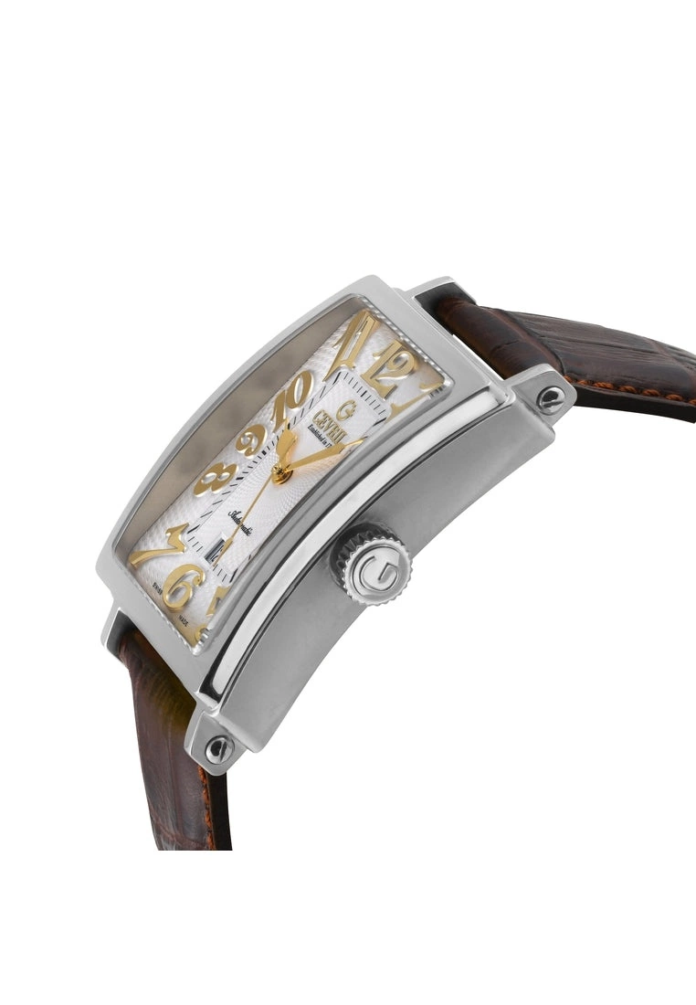 Gevril Men’s Swiss Watch from the Avenue of Americas Collection44mm Rectangle 316L Stainless Steel Case, White Dial, Screw Down CrownDate at 6 o’clockGenuine Light Brown/Brown Stitching Handmade Leather Strap with Tang BuckleAnti-reflective Sapphire CrystalWater Resistant to 50 Meters/5ATMSwiss Made Automatic, Sellita SW200 Movement