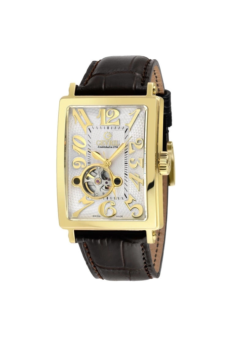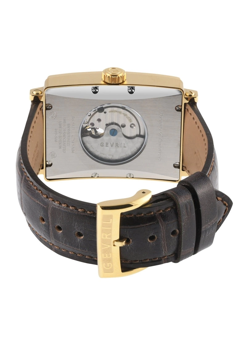SpecificationsGevril 5173-6 Men’s Avenue of America Intravedere Swiss Automatic WatchGevril Men’s Swiss Watch from the Avenue of Americas Intravedere Collection44mm Rectangle IPYG Case, White Dial, Screw Down CrownSecond hand; balance wheel windowGenuine Dark Brown Handmade Leather Strap with Tang BuckleAnti-reflective Sapphire CrystalWater Resistant to 50 Meters/5ATMSwiss Made Automatic, M07G