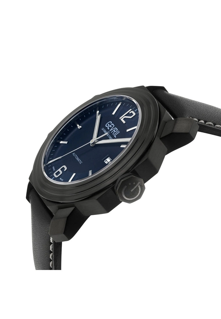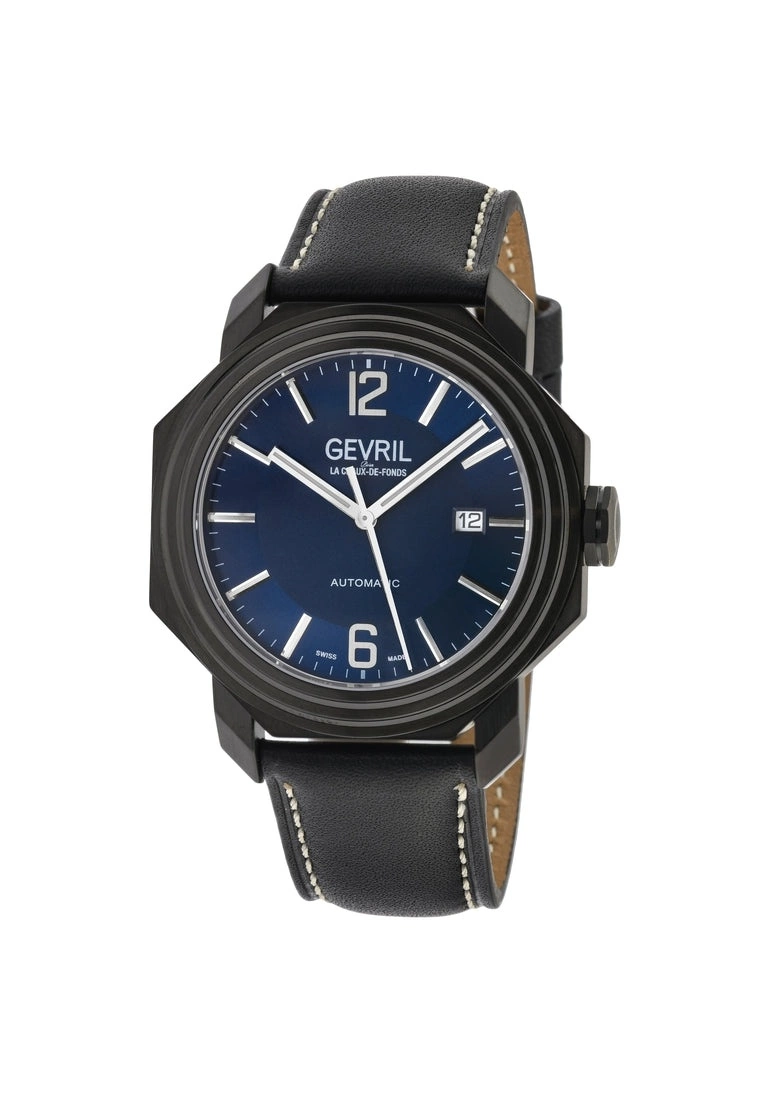 As adventurous as its namesake, the Canal Street Collection by Gevril captures the energy of this bold, buzzing New York City street in a new signature series of watches. Downtown Manhattan is as known for the enduring high fashion as it is for edgy street style. Balanced between the hip Chelsea neighborhood and upscale SoHo, no thoroughfare represents this juxtaposition better than the bustling Canal Street. In this series of watches by Gevril, luxe details, precision design, and robust styling combine, featuring precision Swiss Automatic movement.SpecificationsGevril 46512 Men’s Canal St Automatic WatchGevril Men’s Canal St Automatic Watch44mm Octagon 316L Stainless Steel Black Case Blue Dial with Exhibition Case Back WindowDate at 3H, Silver Indices applied on dialScrew down CrownGenuine Black Leather Strap with Tang BuckleAnti-reflective Sapphire CrystalWater Resistant to 50 Meters/5ATMSwiss Made Automatic, Sellita SW200 Movement