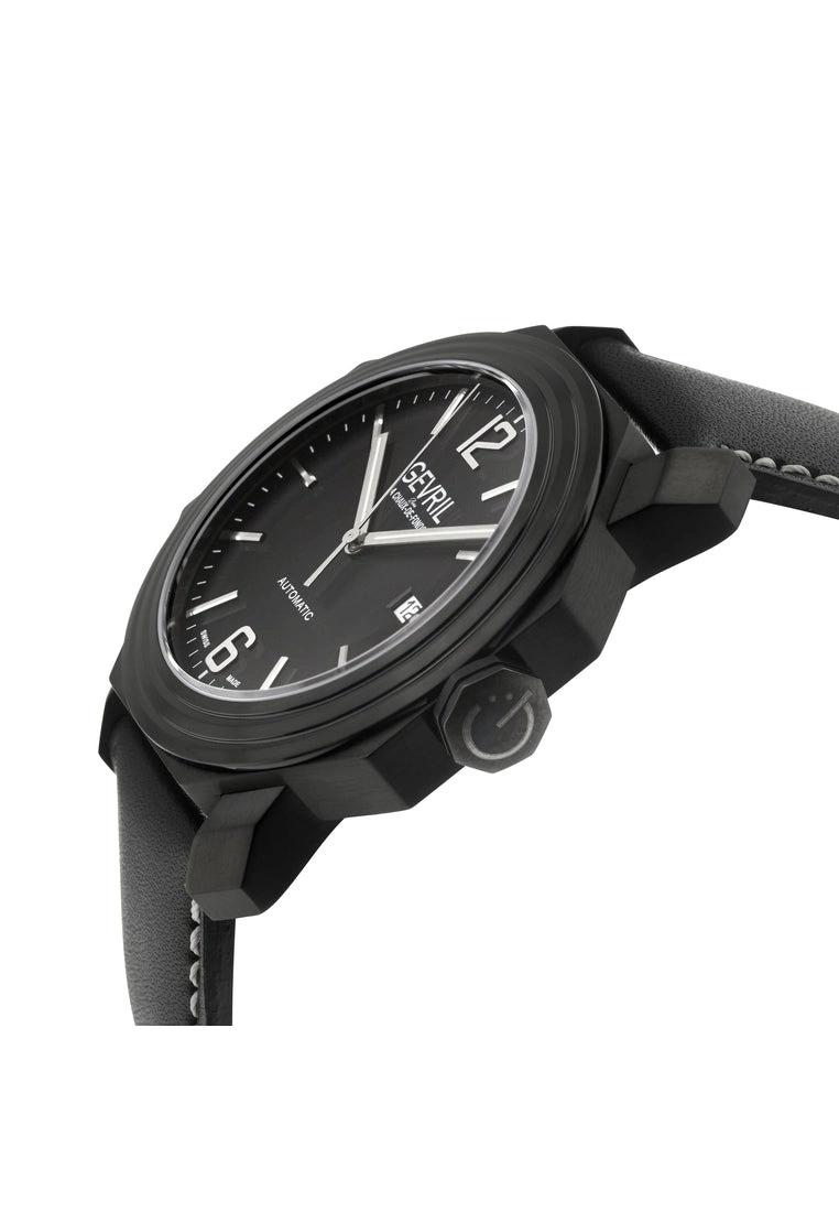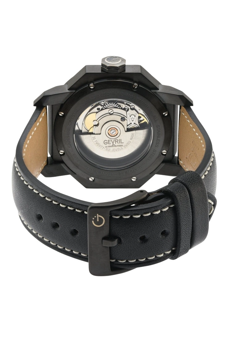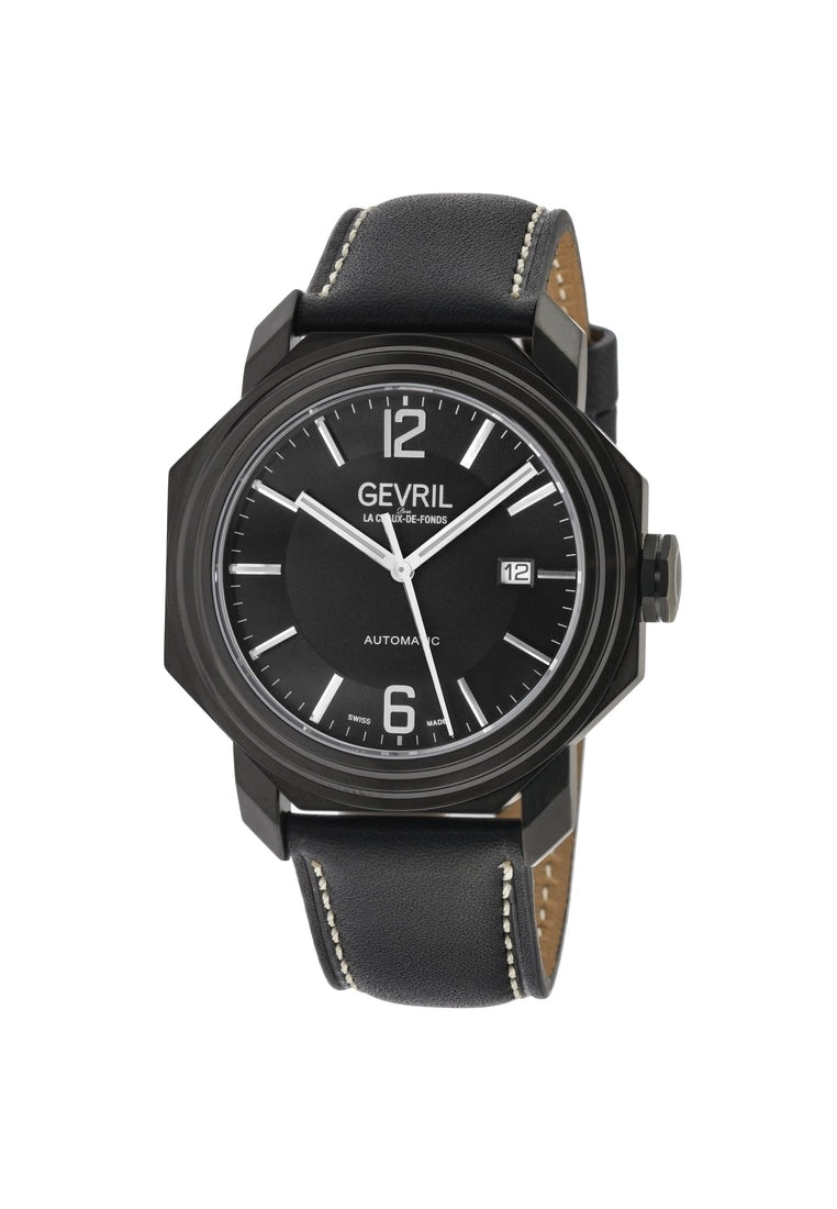 As adventurous as its namesake, the Canal Street Collection by Gevril captures the energy of this bold, buzzing New York City street in a new signature series of watches. Downtown Manhattan is as known for the enduring high fashion as it is for edgy street style. Balanced between the hip Chelsea neighborhood and upscale SoHo, no thoroughfare represents this juxtaposition better than the bustling Canal Street. In this series of watches by Gevril, luxe details, precision design, and robust styling combine, featuring precision Swiss Automatic movement.SpecificationsGevril 46511 Men’s Canal St Automatic WatchGevril Men’s Canal St Automatic Watch44mm Octagon 316L Stainless Steel Black Case Black Dial with Exhibition Case Back WindowDate at 3H, Silver Indices applied on dialScrew down CrownGenuine Black Leather Strap with Tang BuckleAnti-reflective Sapphire CrystalWater Resistant to 50 Meters/5ATMSwiss Made Automatic, Sellita SW200 Movement